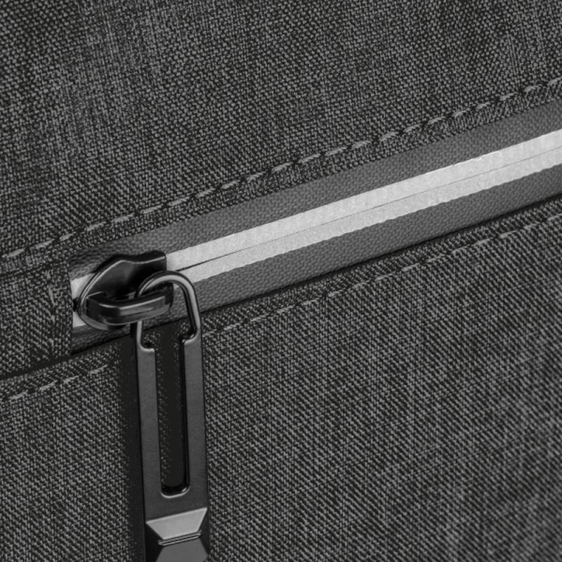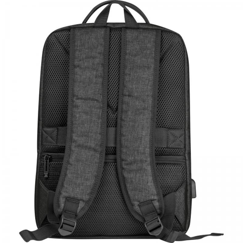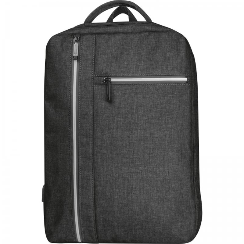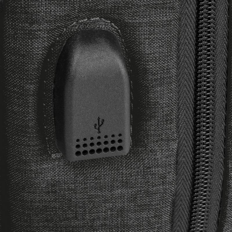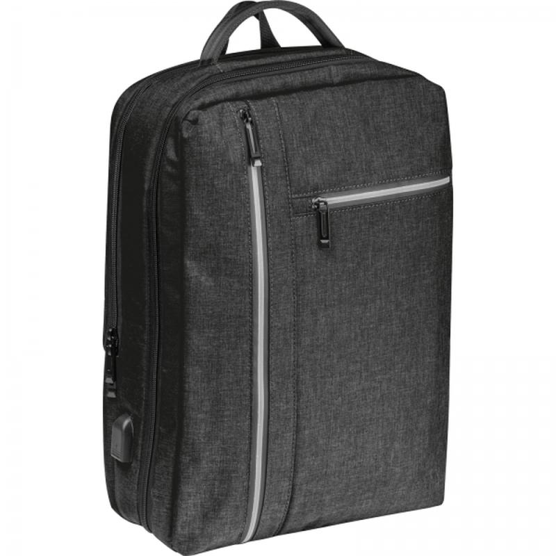 Wodoodporny plecak wykonany z nylonu, z watowanymi szelkami, przegrodą na laptopa 15,6`, wyjściem na kabel USB i dwiema przednimi kieszeniami.