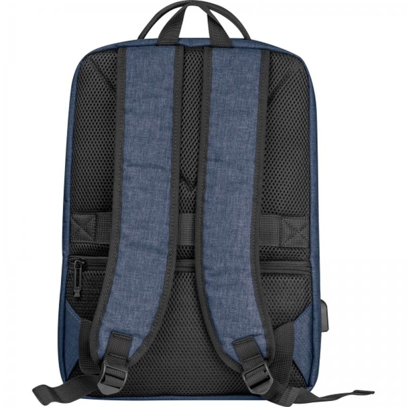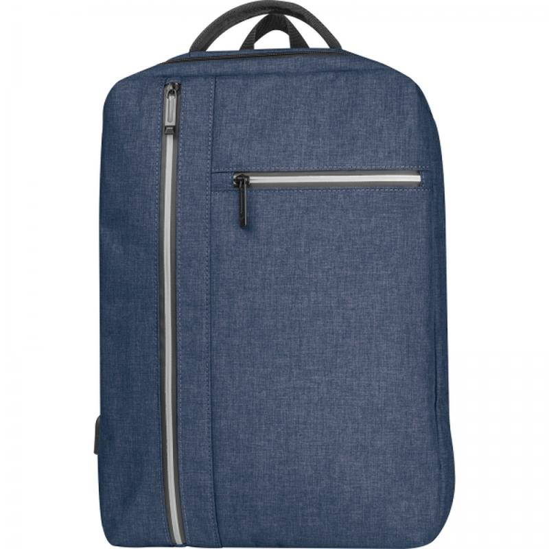 Wodoodporny plecak wykonany z nylonu, z watowanymi szelkami, przegrodą na laptopa 15,6`, wyjściem na kabel USB i dwiema przednimi kieszeniami.