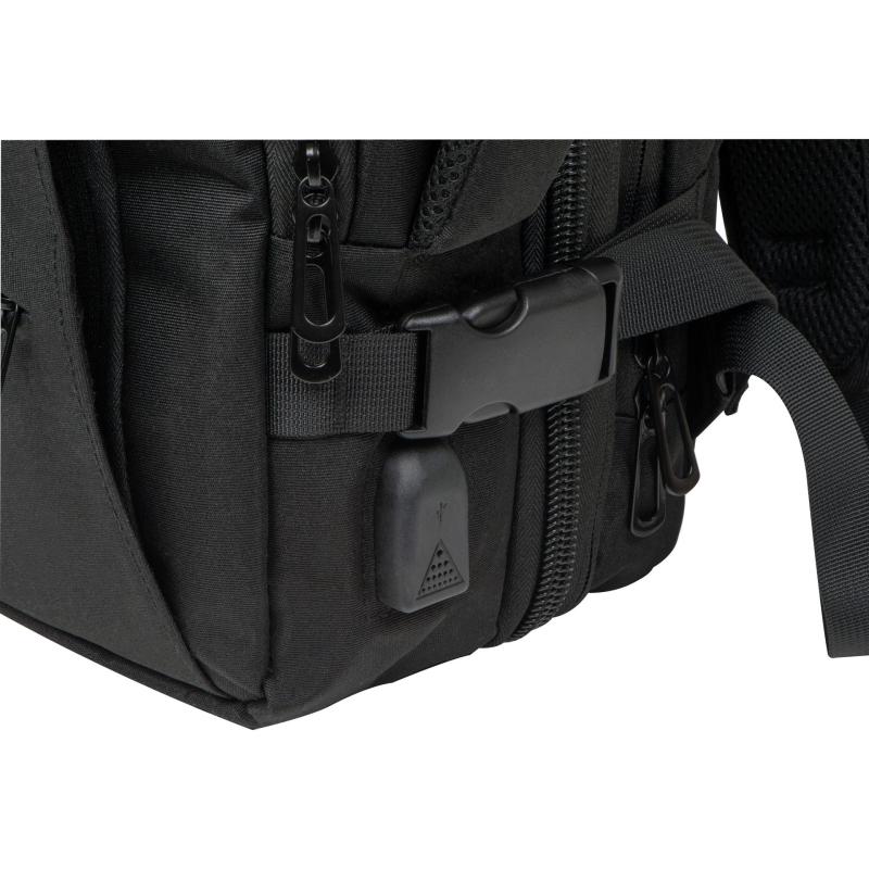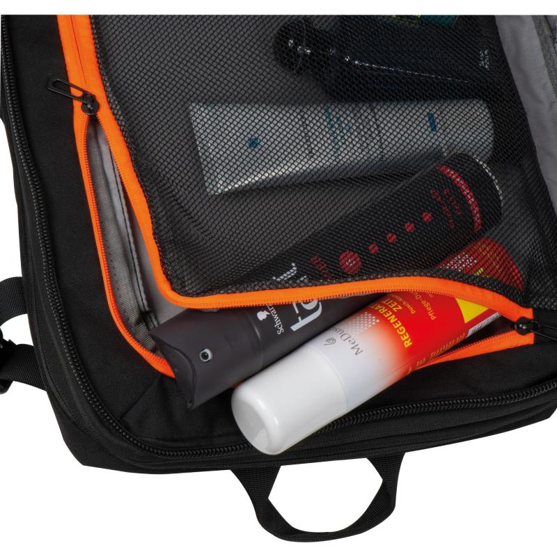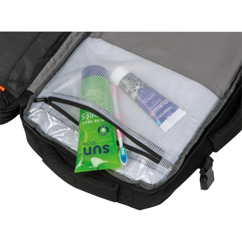Plecak podróżny otwierany jak walizka, z trzema przegródkami zapinanymi na zamek. Dobrze zorganizowane wnętrze wyposażone jest w przegródkę na laptopa, wiele mniejszych przegródek oraz kieszeń z siatką do przechowywania kosmetyków. Pojemność 22l, dzięki bocznym paskom można powiększyć do 37l.