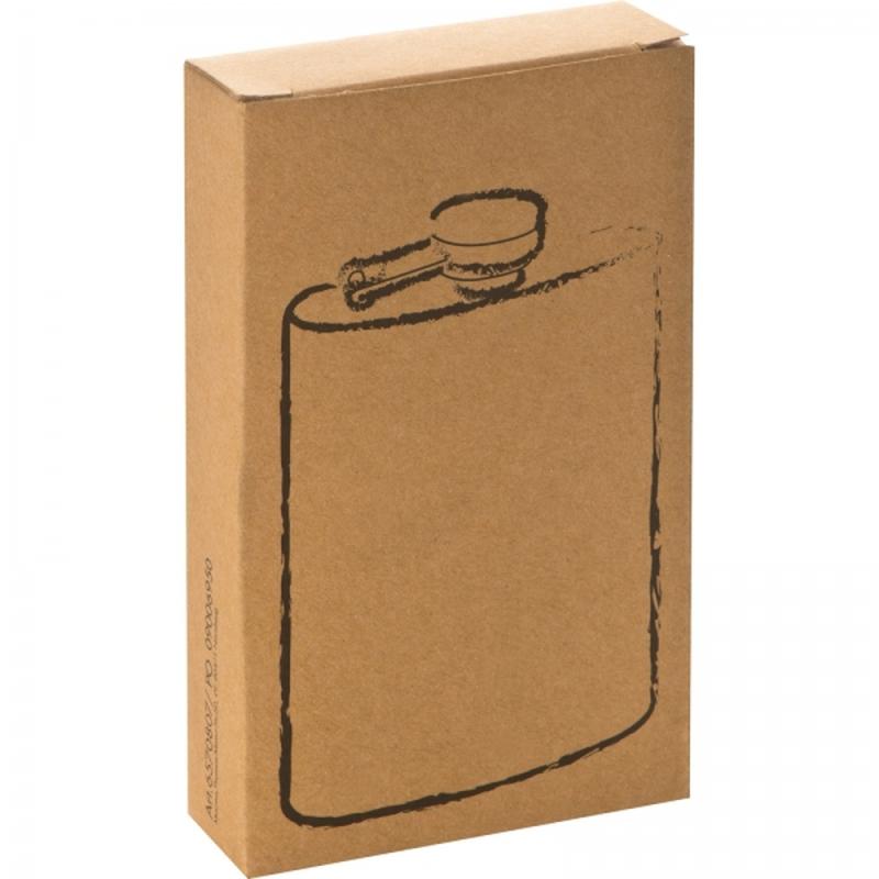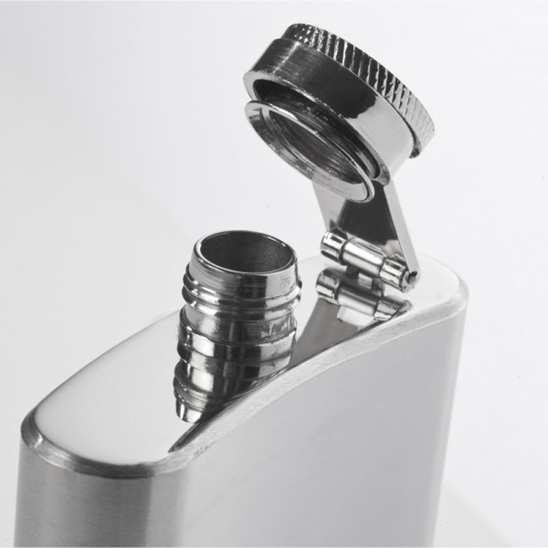Mała piersiówka ze stali nierdzewnej z bezpiecznym zamknięciem, pojemność 104 ml.