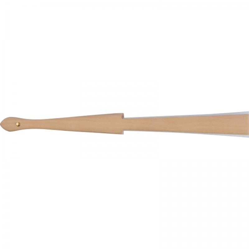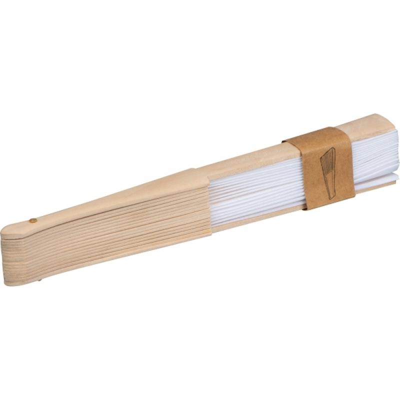 Papierowy wachlarz z drewnianą rączką, idealnie sprawdzi się w upalne letnie dni.