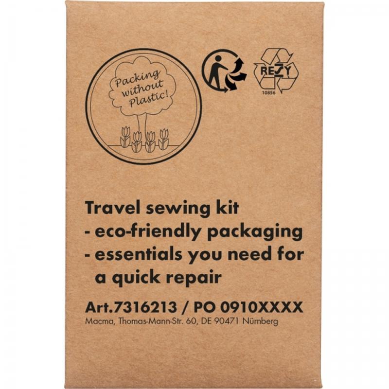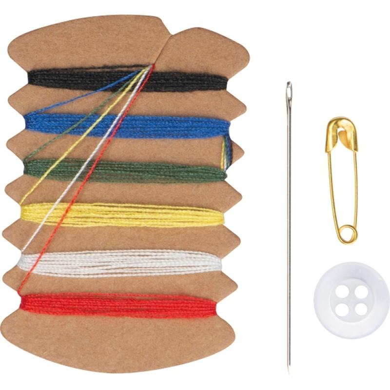 Podróżny zestaw nici do szycia. W kartonowym opakowaniu, znajdziesz wszystkie najpotrzebniejsze przybory by dokonać szybkiej naprawy: 6 nici w podstawowych kolorach, igłę i guzik.