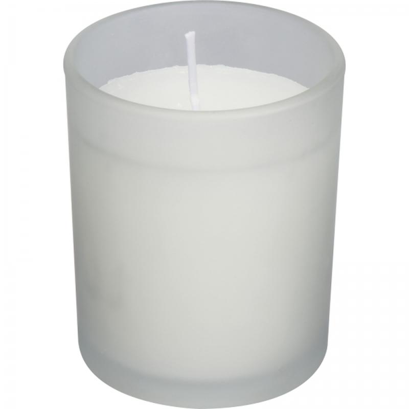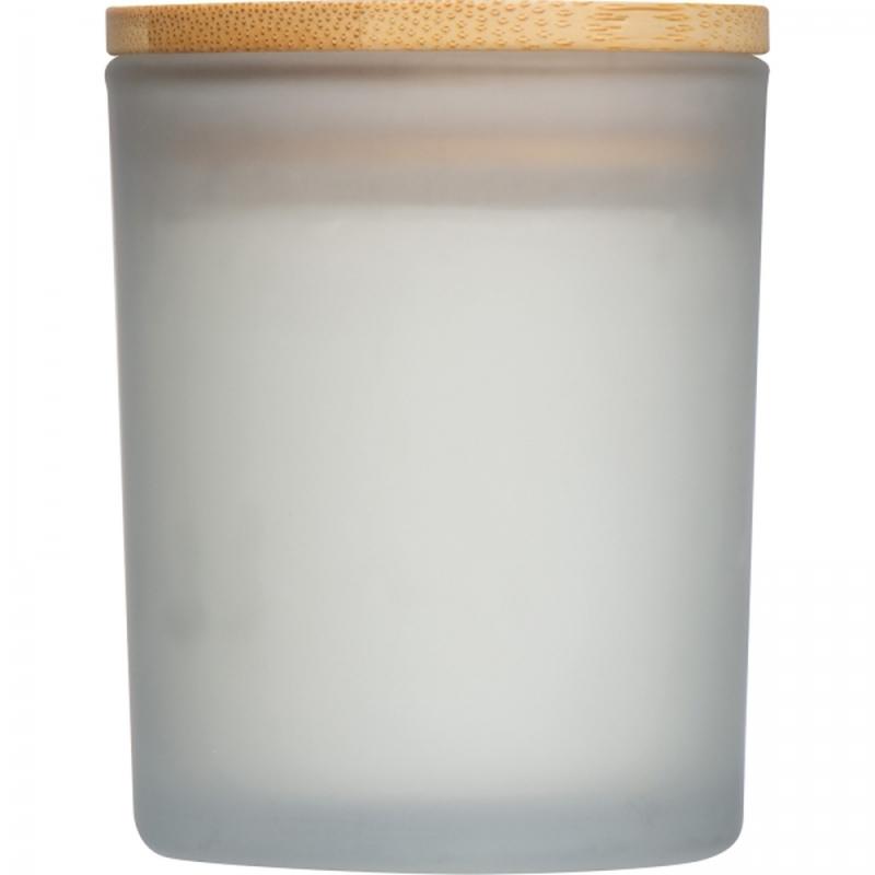 Świeczka dekoracyjna w szklanym pojemniku z bambusowym wieczkiem. Świeczka pakowana w kartonik.