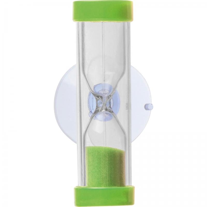 Mała klepsydra wypełniona kolorowym piaskiem, jedno przesypanie się piasku trwa 3 minuty.