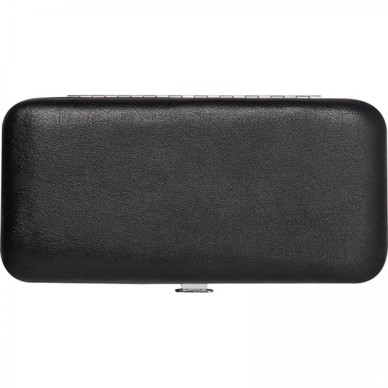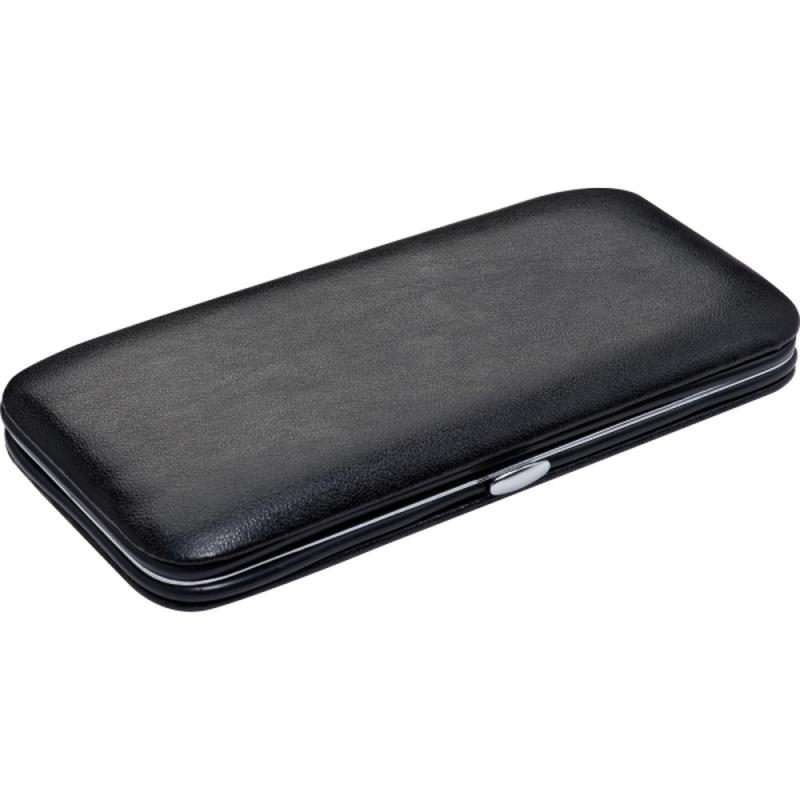 Zestaw do manicure, składający się z nożyczek, cążków, pęsety, diamentowego pilnika oraz przyrządu do usuwania skórek i czyszczenia paznokci. Etui z PU, wyposażenie ze stali nierdzewnej.