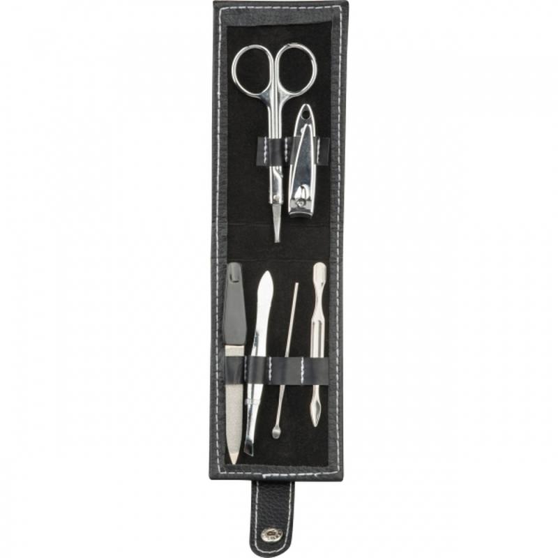 Zestaw do manicure składający się z 7 przyborów, całość zapakowana w skórzane etui.