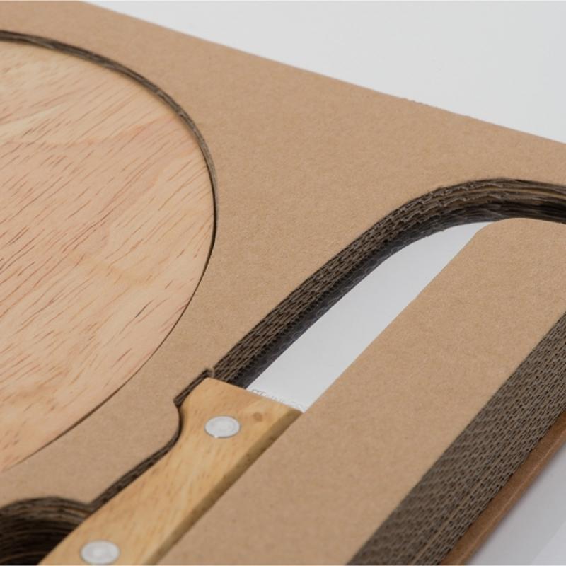 Drewniana deska do serów z nożem wykonanym ze stali nierdzewnej.