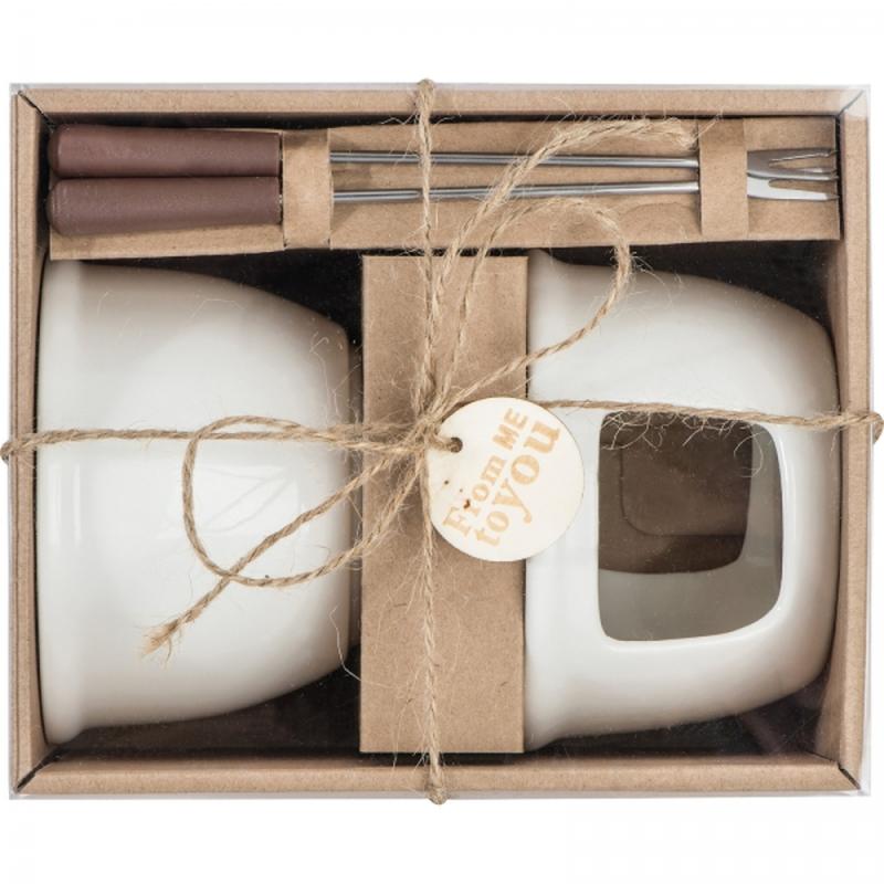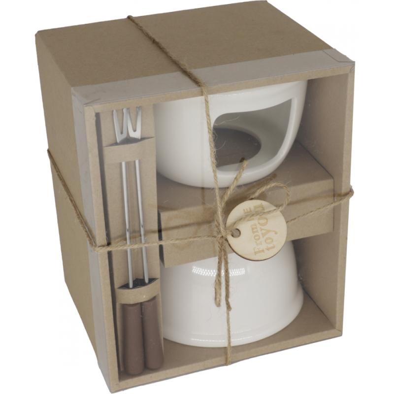 Porcelanowy zestaw do fondue z dwoma metalowymi widelcami i miejscem na podgrzewacz. Całość zapakowana w pudełko prezentowe.