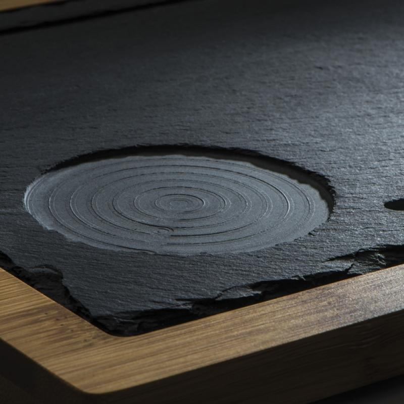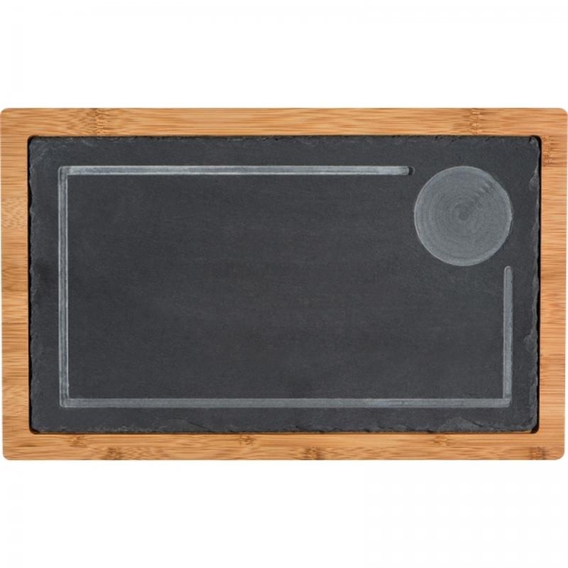 Bambusowa deska z płytą łupkową. Na tacy znajduje się miejsce na kubek oraz zagłębienie, które zatrzyma napój w przypadku rozlania.