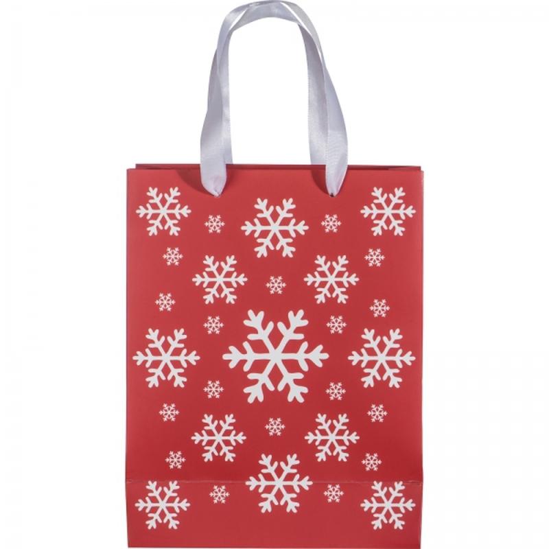 Świąteczna, papierowa torba na prezenty z dwoma uchwytami, z motywem śnieżynek.