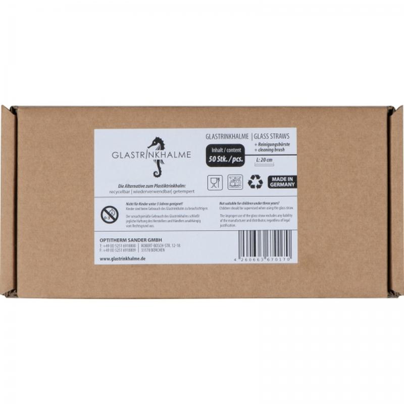 Wielorazowa rurka do picia o długości 20 cm ze szkła hartowanego. Cena za jedną sztukę. Pakowana w zestawie 50 sztuk ze szczoteczką do czyszczenia. Można myć w zmywarce.