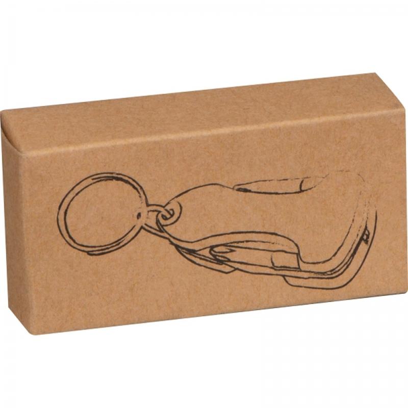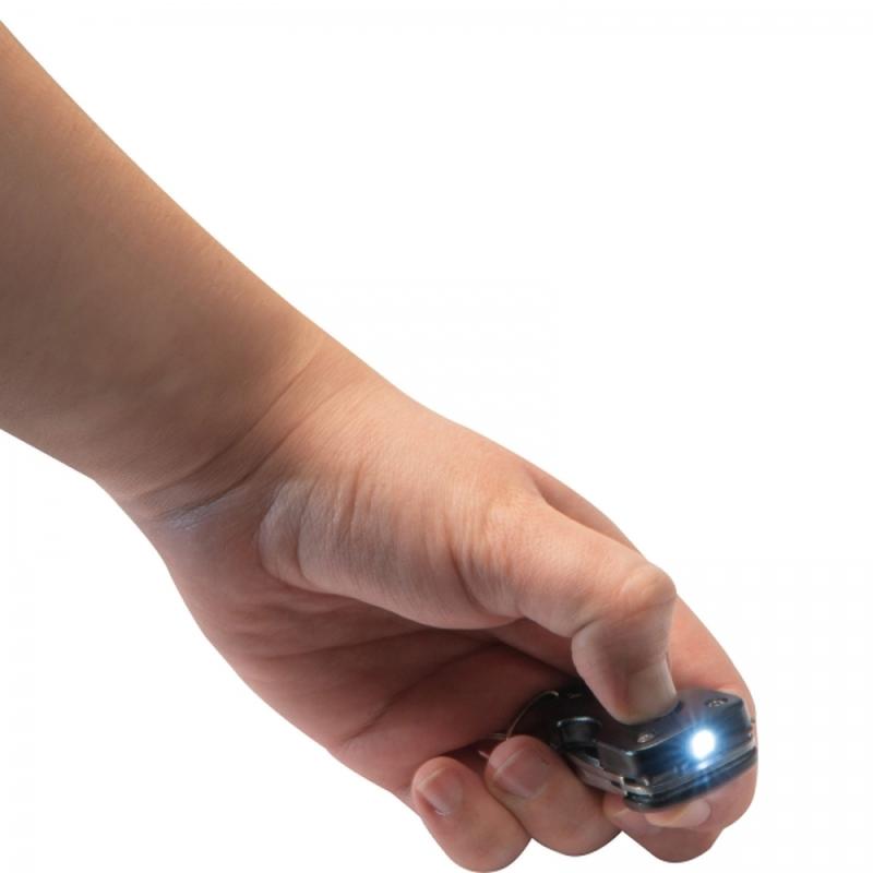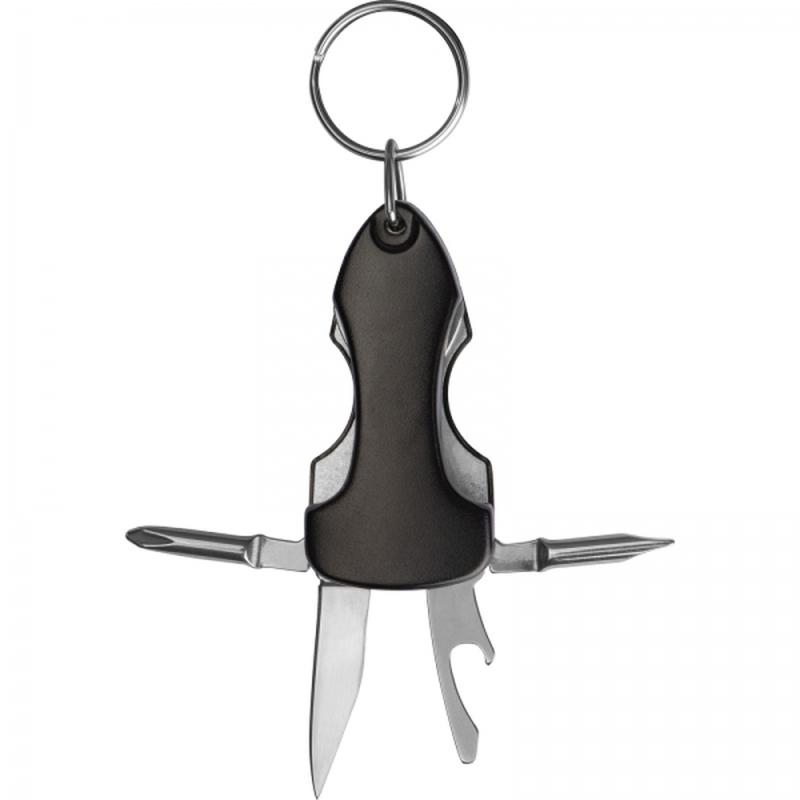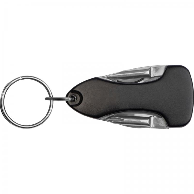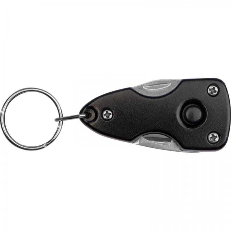 Metalowy brelok, który zawiera lampkę LED, płaski i krzyżakowy śrubokręt, otwieracz do butelek oraz nożyk.