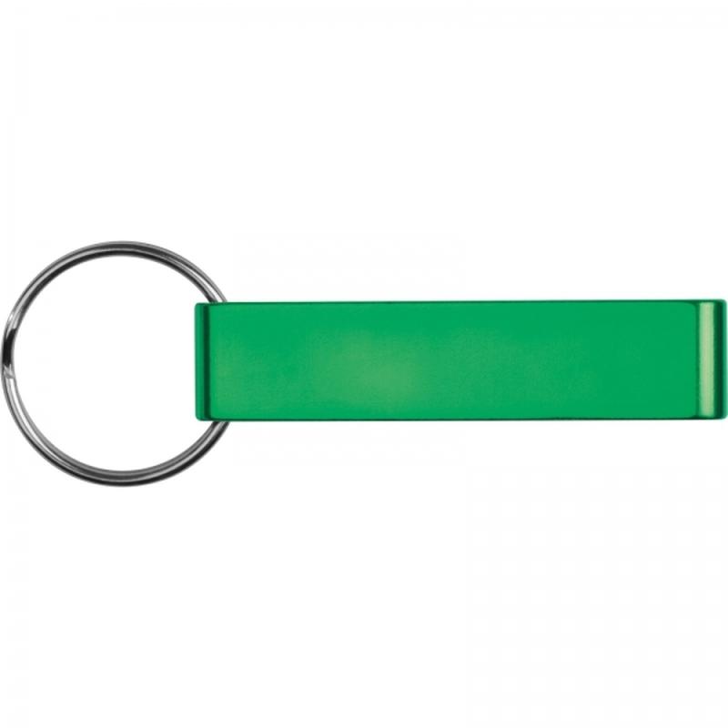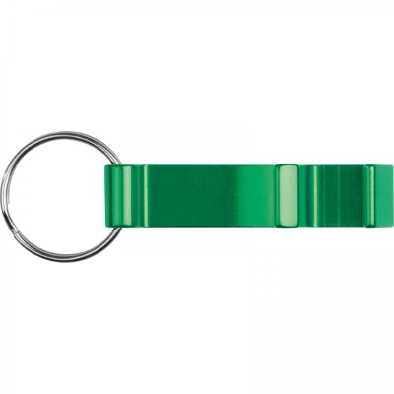 Metalowy brelok z otwieraczem do butelek, którego można użyć również jako stojaka na telefon.