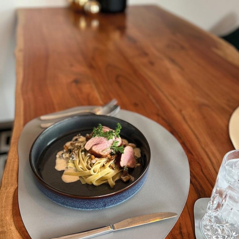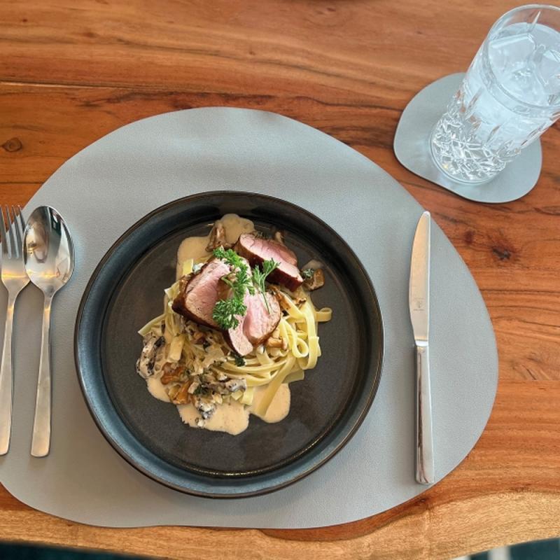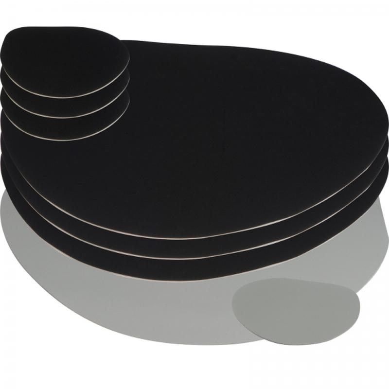 Zestaw podkładek na stół wykonanych z PVC. Zawiera 4 duże podkładki pod talerze i 4 małe pod kubki czy szklanki.