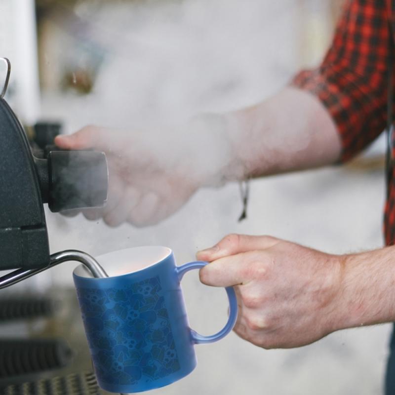Efektowny kubek ceramiczny do sublimacji - kiedy jest zimny, nie widać nadruku, ale po wypełnieniu go ciepłym napojem reklama staje się widoczna. Zalecane mycie ręczne.
