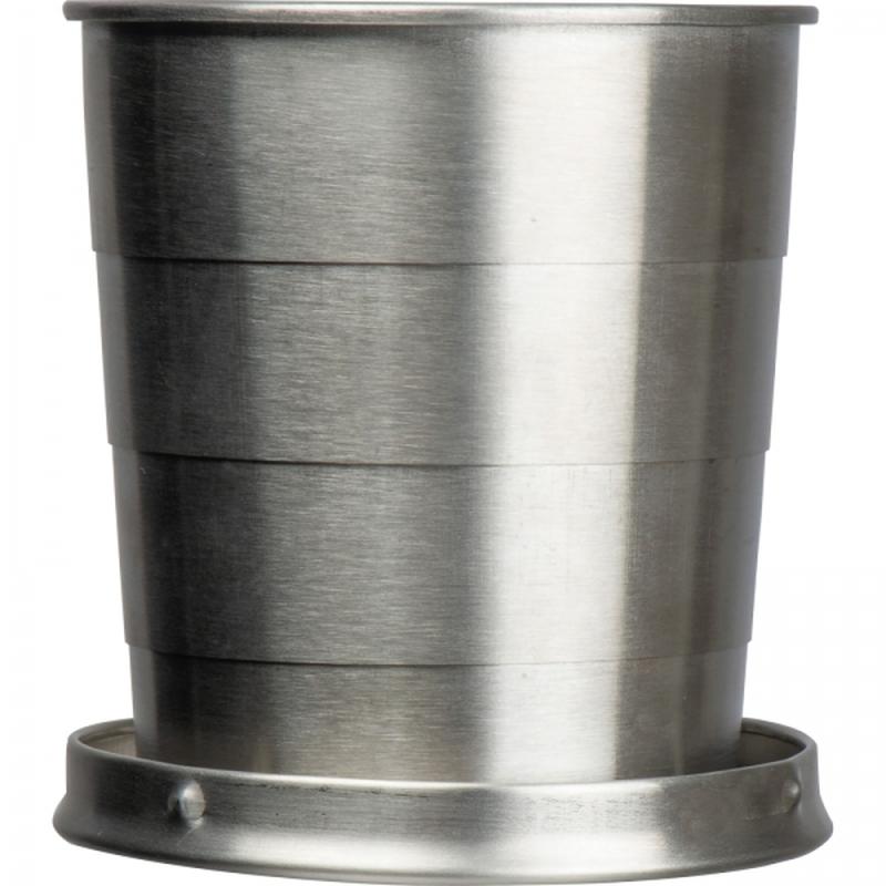 Składany kubek do picia ze stali nierdzewnej o pojemności 250 ml. Można go przechowywać w zintegrowanej metalowej puszce z karabińczykiem, aby zaoszczędzić miejsce.
