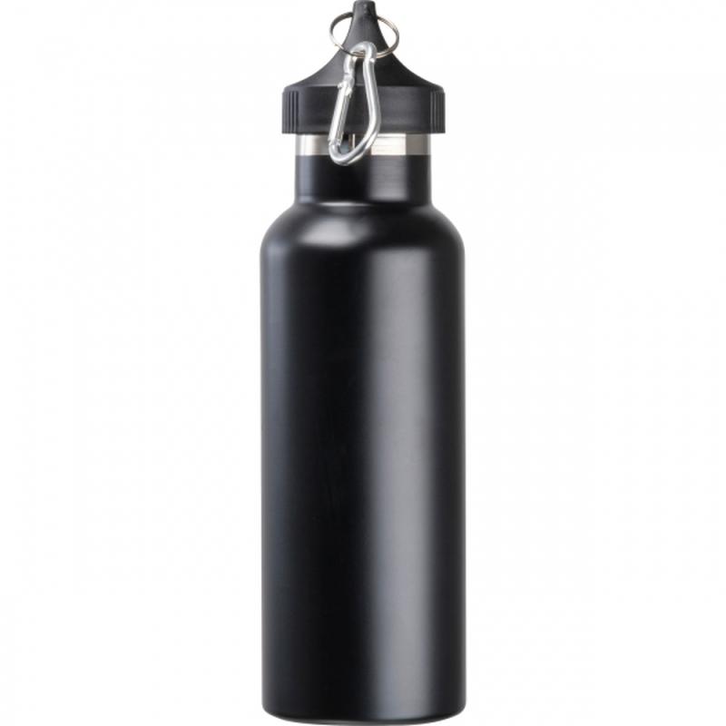 Butelka termiczna ze stali nierdzewnej, z matową powłoką. W zakrętce znajduje się karabińczyk, dzięki któremu butelkę można przymocować np. do plecaka.