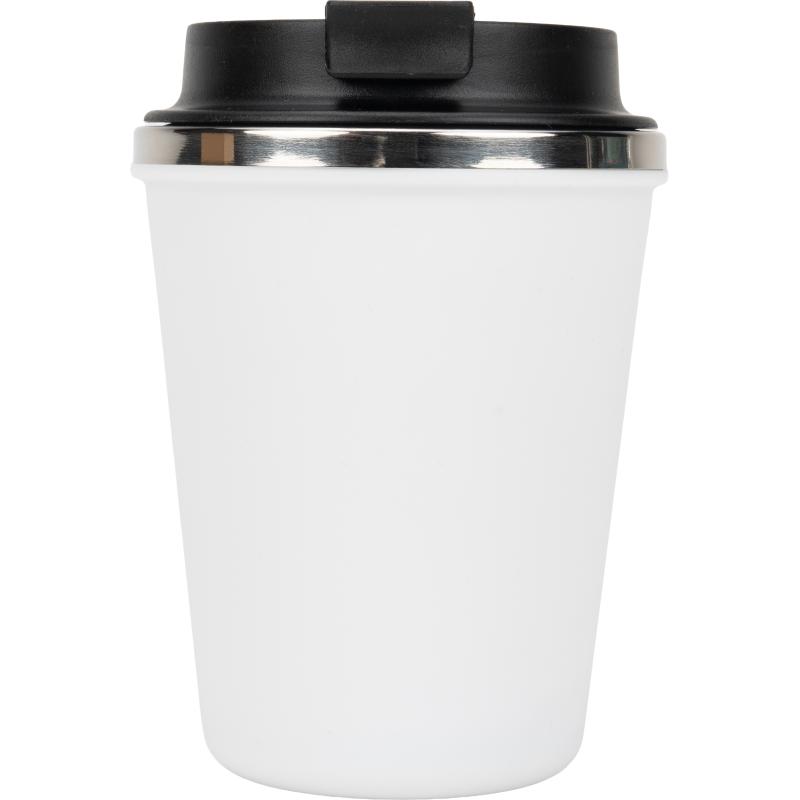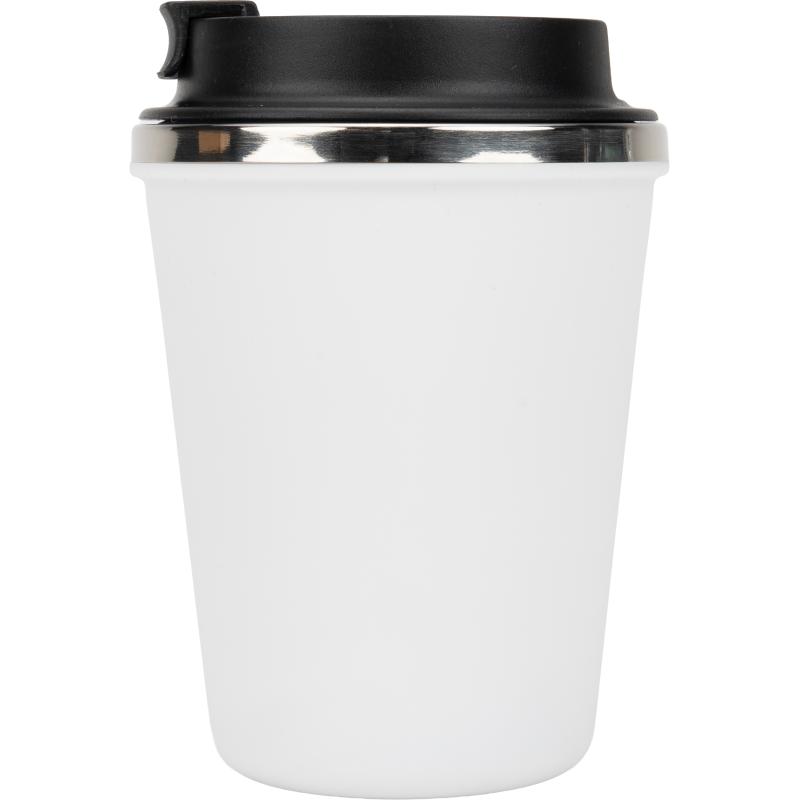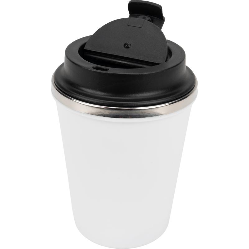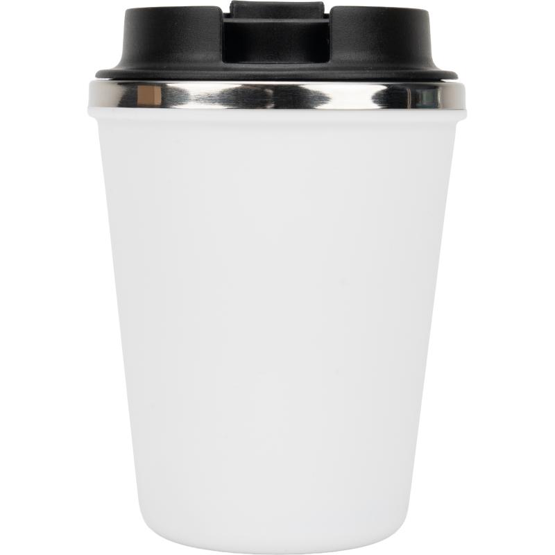 Kubek z podwójnymi ściankami ze stali nierdzewnej, z zewnątrz z plastikową powłoką z materiału pochodzącego z recyklingu, o pojemności 350 ml, z zamykanym ustnikiem.