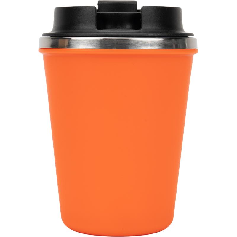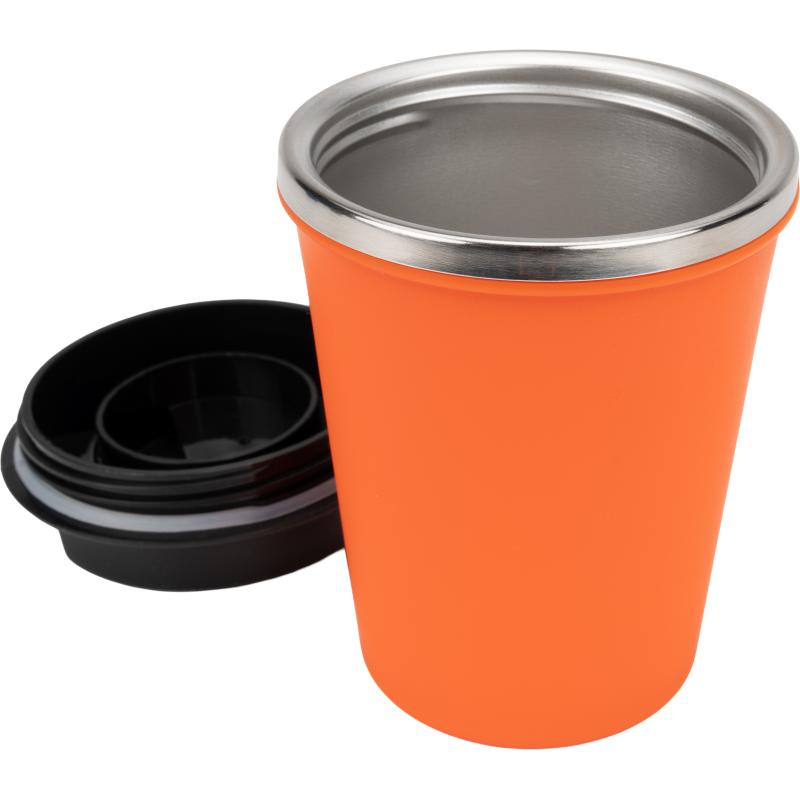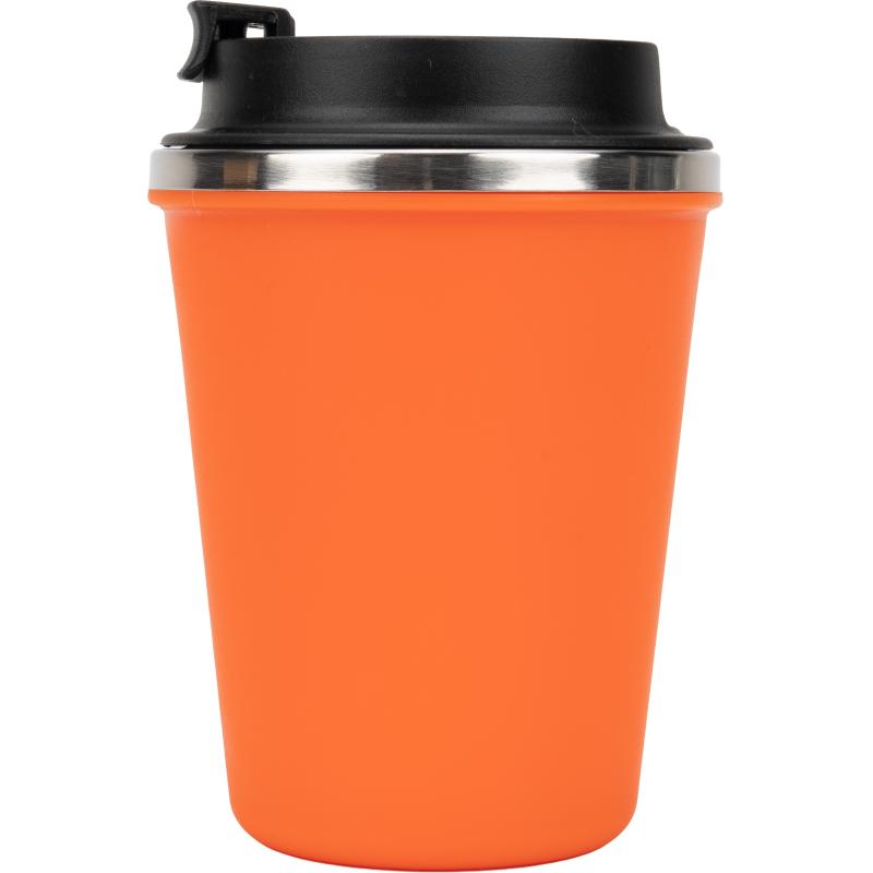 Kubek z podwójnymi ściankami ze stali nierdzewnej, z zewnątrz z plastikową powłoką z materiału pochodzącego z recyklingu, o pojemności 350 ml, z zamykanym ustnikiem.