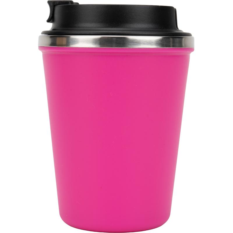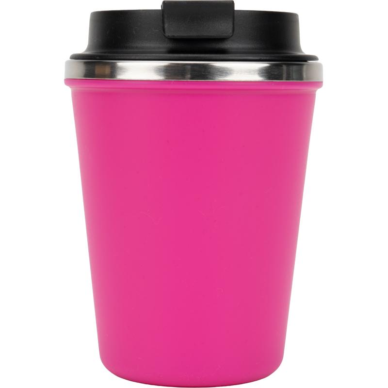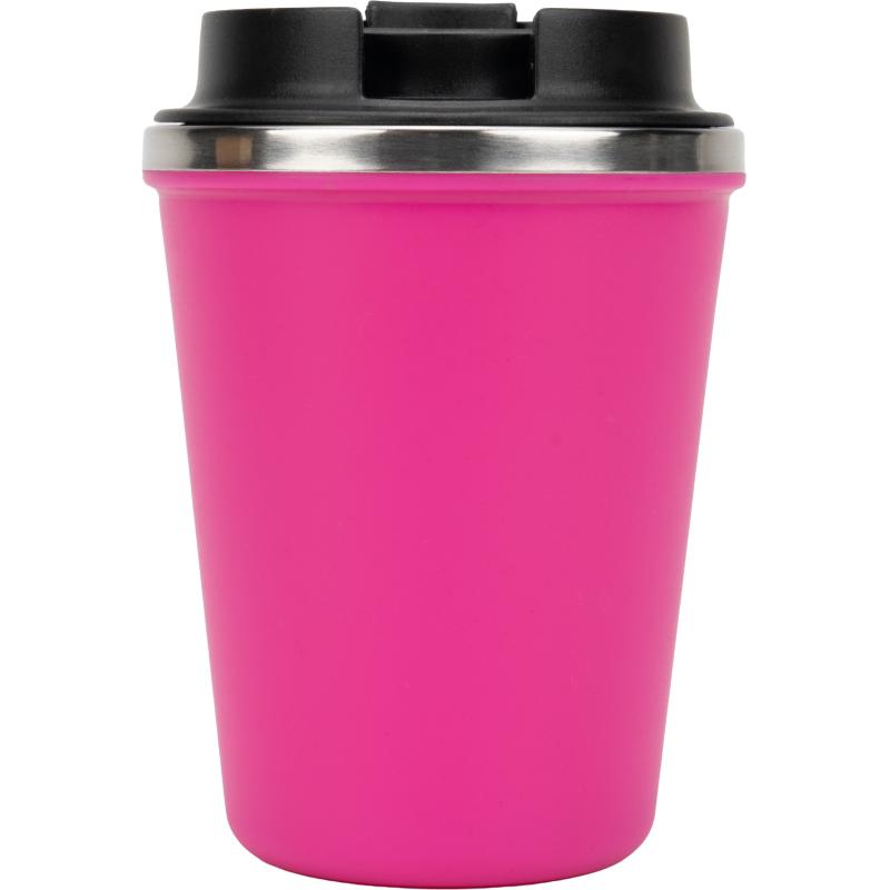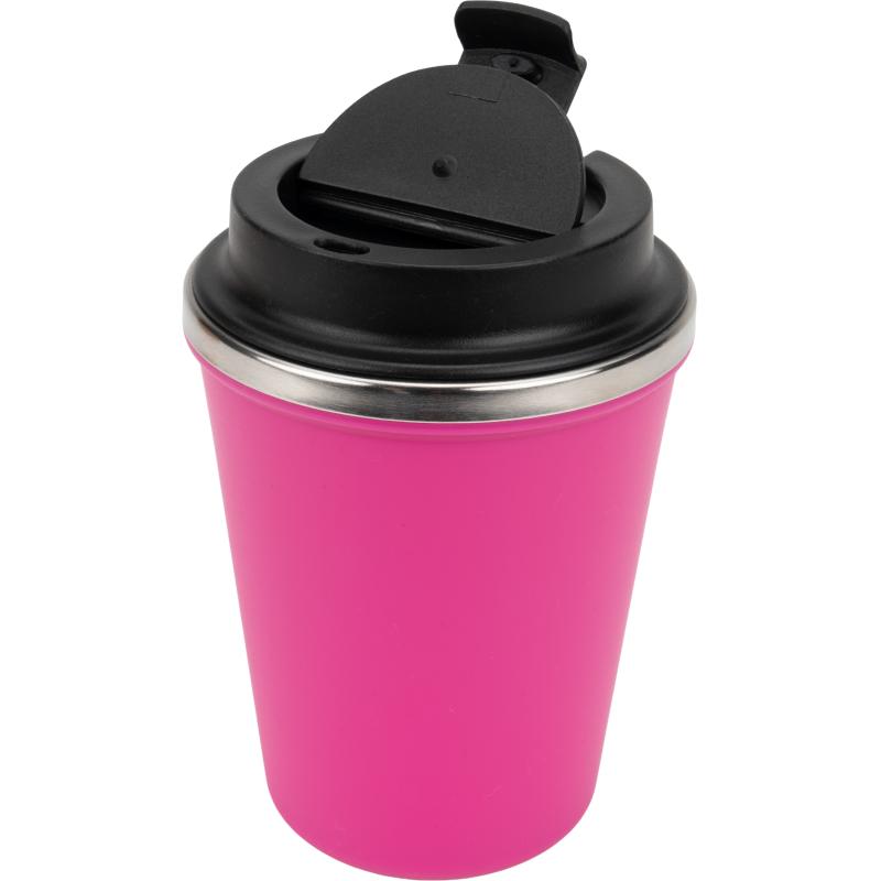 Kubek z podwójnymi ściankami ze stali nierdzewnej, z zewnątrz z plastikową powłoką z materiału pochodzącego z recyklingu, o pojemności 350 ml, z zamykanym ustnikiem.