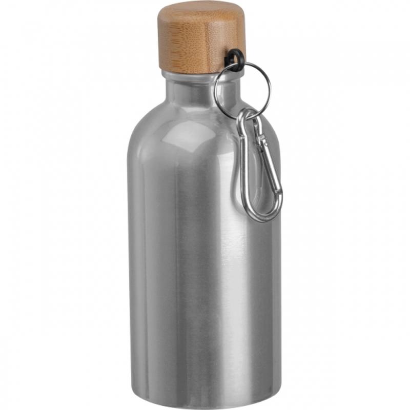 Butelka wykonana ze stali nierdzewnej, o pojemności 400 ml, z bambusową zakrętką do której został przymocowany karabińczyk.