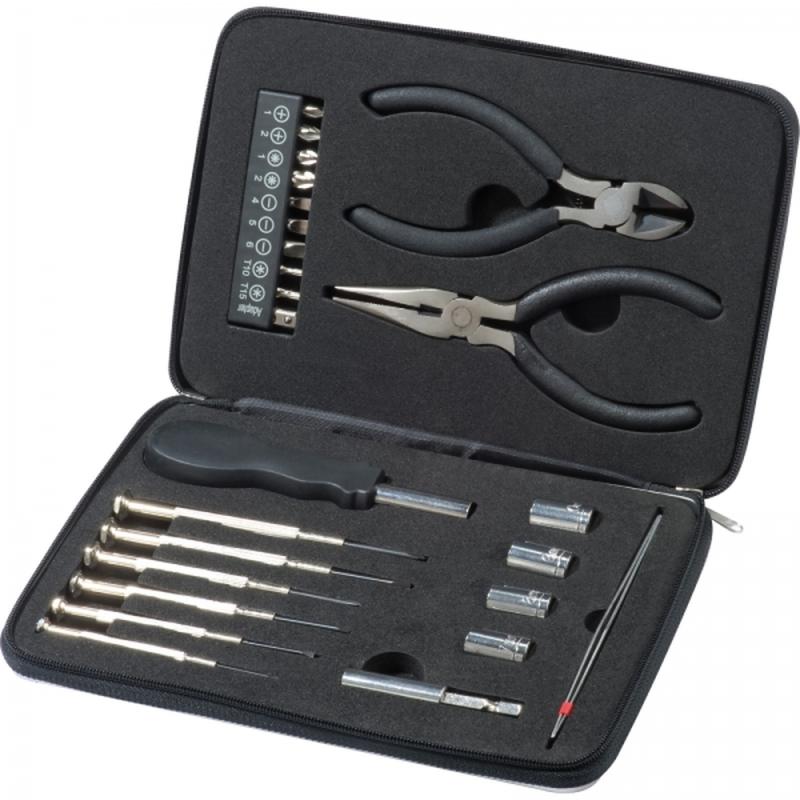 25-częściowy zestaw narzędzi w aluminiowym etui zamykanym na zamek, zawiera m.in.: szczypce, obcinaczki, zestaw wkrętaków precyzyjnych, uchwyt do bitów i nasadek, przedłużkę.