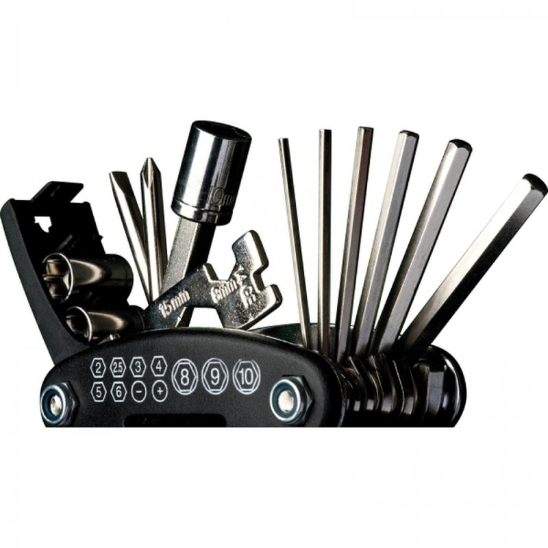 17-częściowy rowerowy zestaw naprawczy z plastiku i metalu. w etui z poliestru. Zawiera m.in. wielofunkcyjne narzędzie i łatki samoprzylepne.