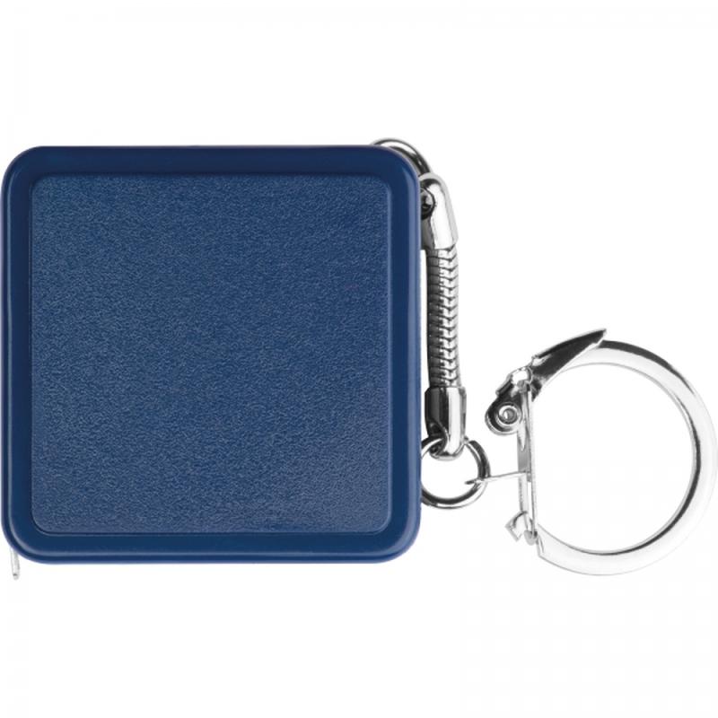 Stalowa miarka o długości 100 cm w kwadratowej obudowie z kolorowego plastiku, zawieszona na praktycznym breloku.