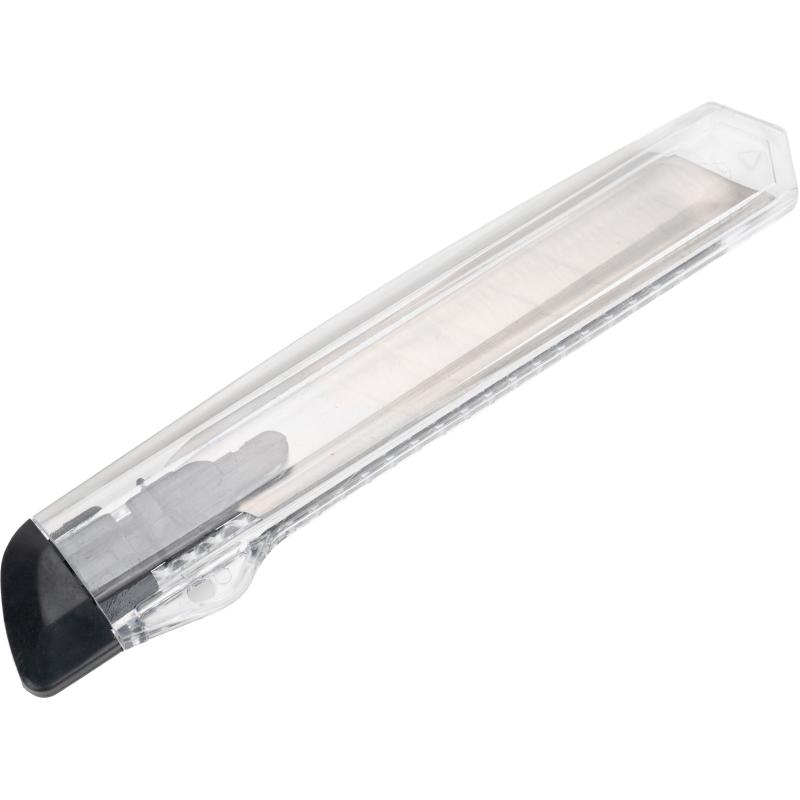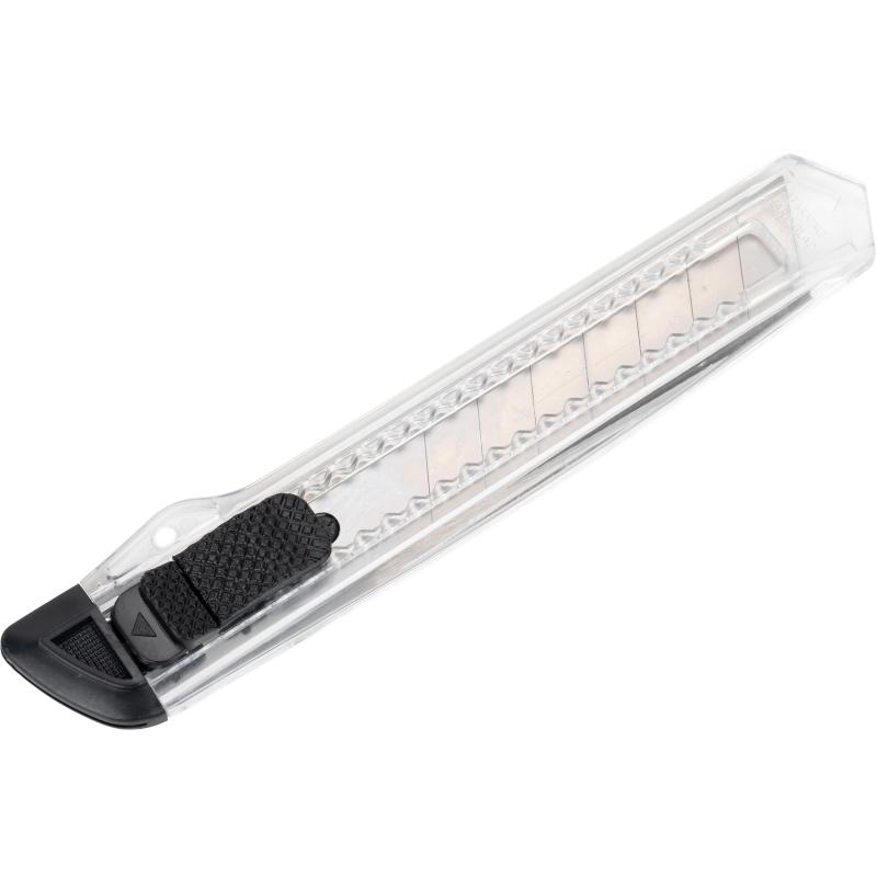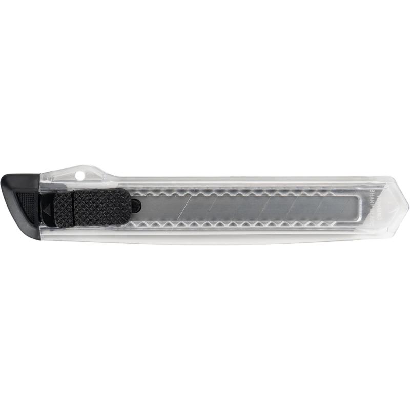 Transparentny nóż do kartonu z kolorową końcówką i łamanym ostrzem, w plastikowej obudowie.