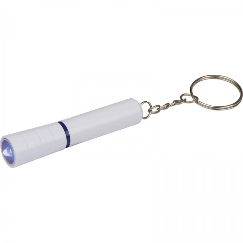 Mała, plastikowa latarka z 1 diodą LED, z brelokiem. Produkt zawiera baterie.
