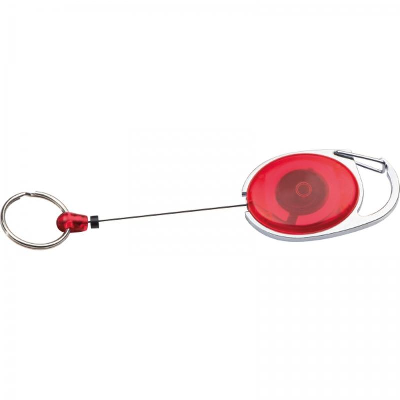 Plastikowy brelok z metalowym karabińczykiem, klipsem do paska oraz kółkiem na zwijanej lince.