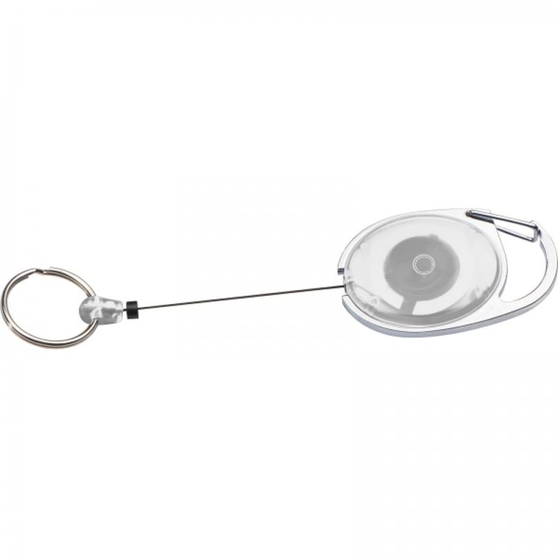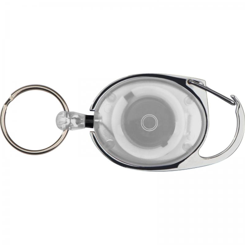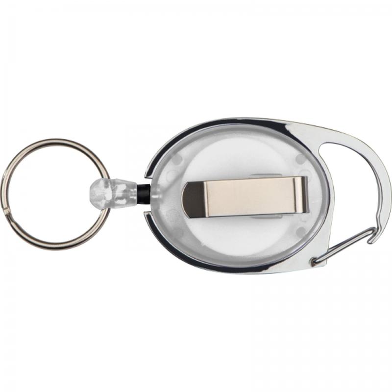 Plastikowy brelok z metalowym karabińczykiem, klipsem do paska oraz kółkiem na zwijanej lince.