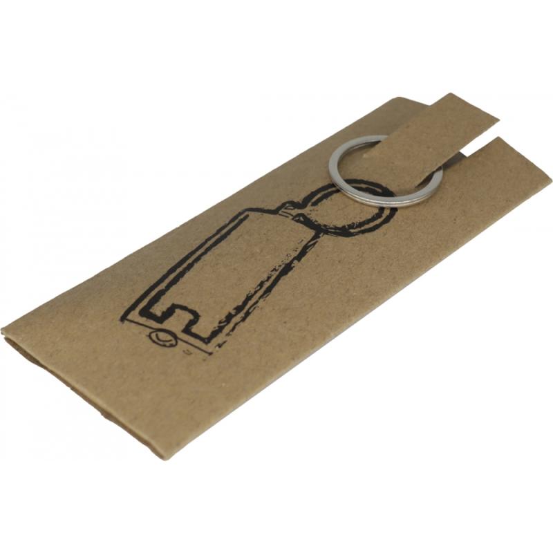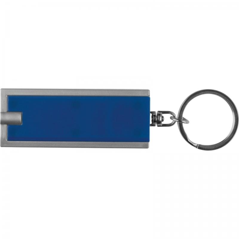Płaski, plastikowy brelok z wbudowaną latarką LED o białym świetle, na metalowym kółku. Produkt zawiera baterie.