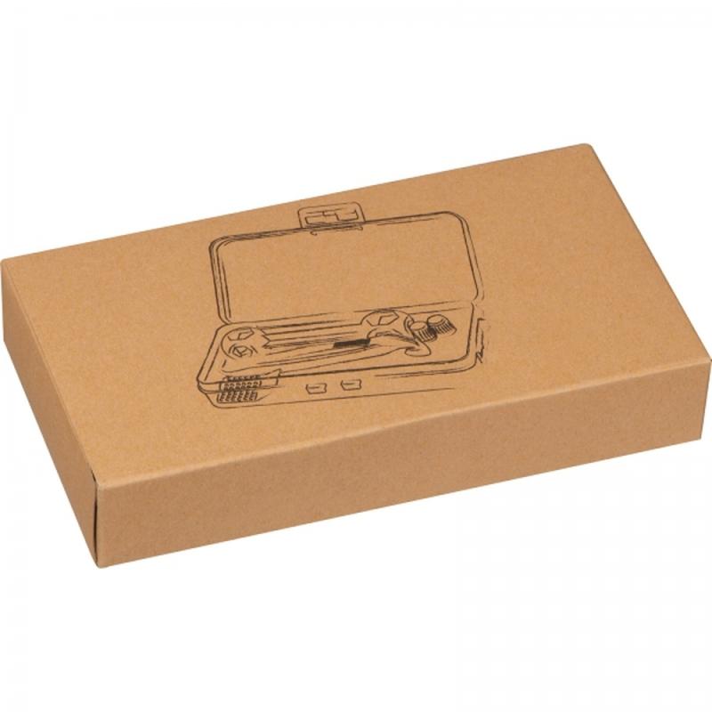 Zestaw narzędzi do naprawy roweru. W zestawie znajduje się listek papieru ściernego, klucz, 5 łatek, 2 wentyle, 2 nakrętki na wentyle oraz 2 łyżki do opon.