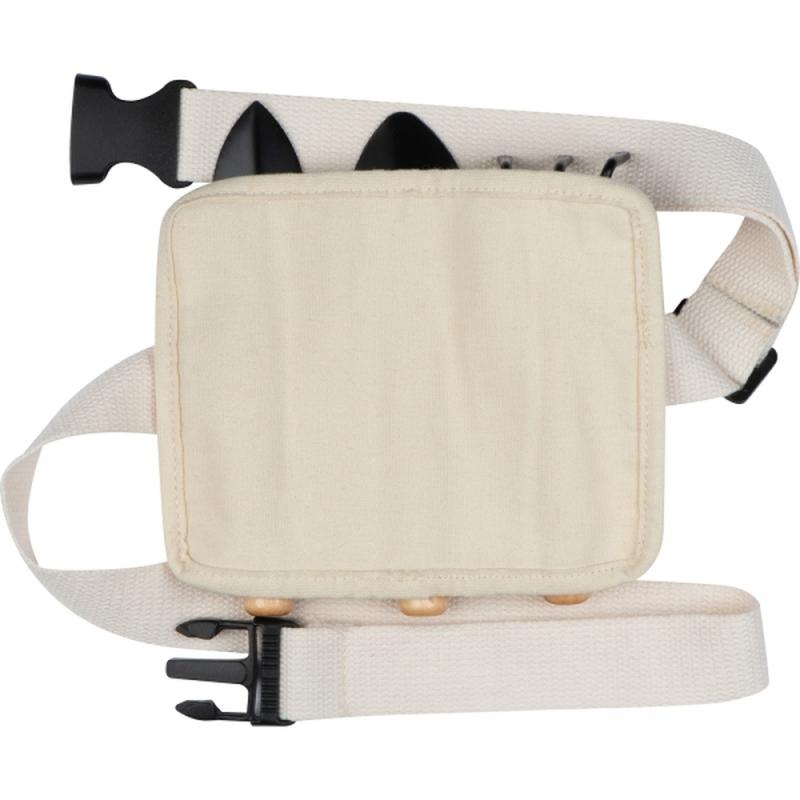 Płócienny pas z zestawem narzędzi ogrodniczych - dwie łopatki o różnej szerokości i grabki.