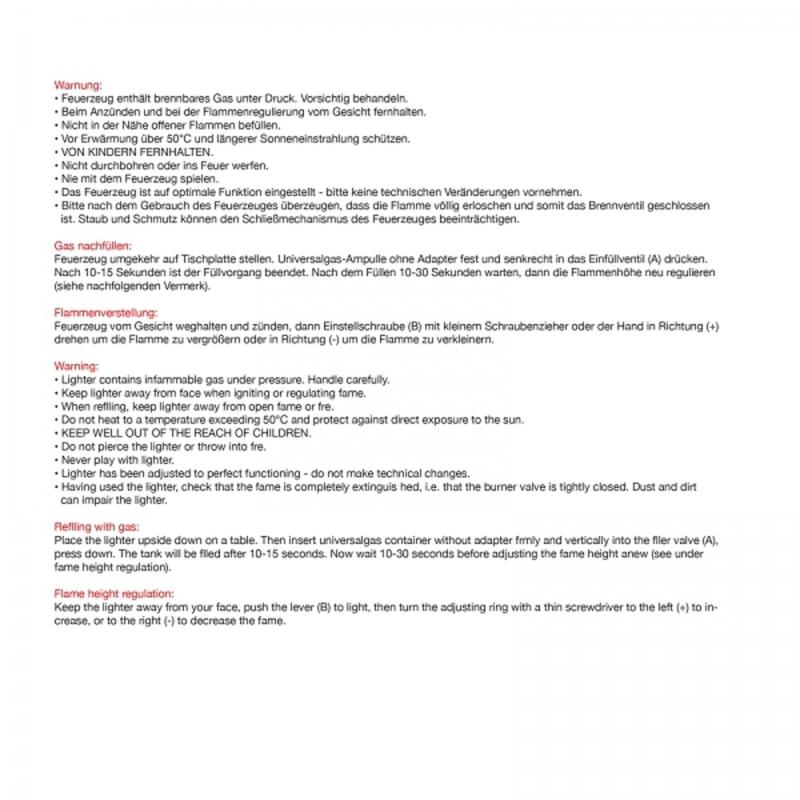 Plastikowa zapalniczka z płynną regulacją płomienia. Możliwość wielokrotnego napełniania.