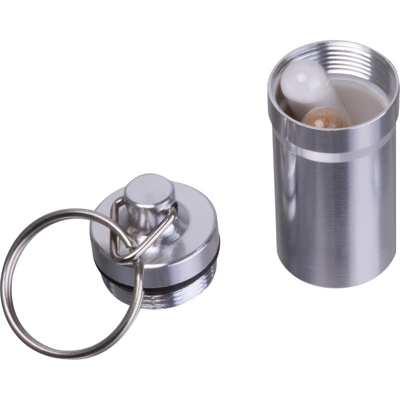 Brelok pojemnik z zewnętrzną powłoką ze stali nierdzewnej oraz wnętrzem z tworzywa sztucznego. Idealny do bezpiecznego przechowywania drobnych przedmiotów w podróży.