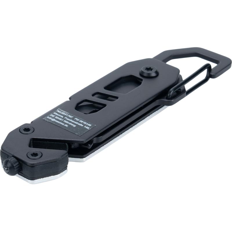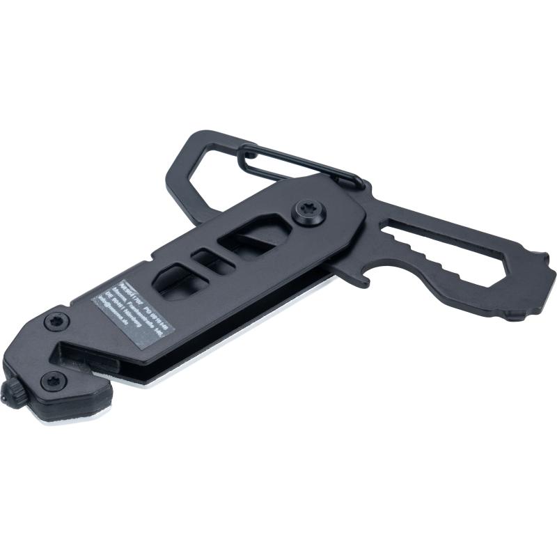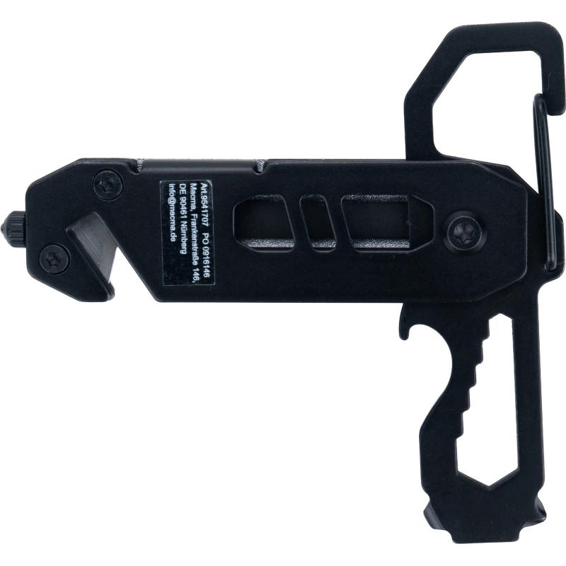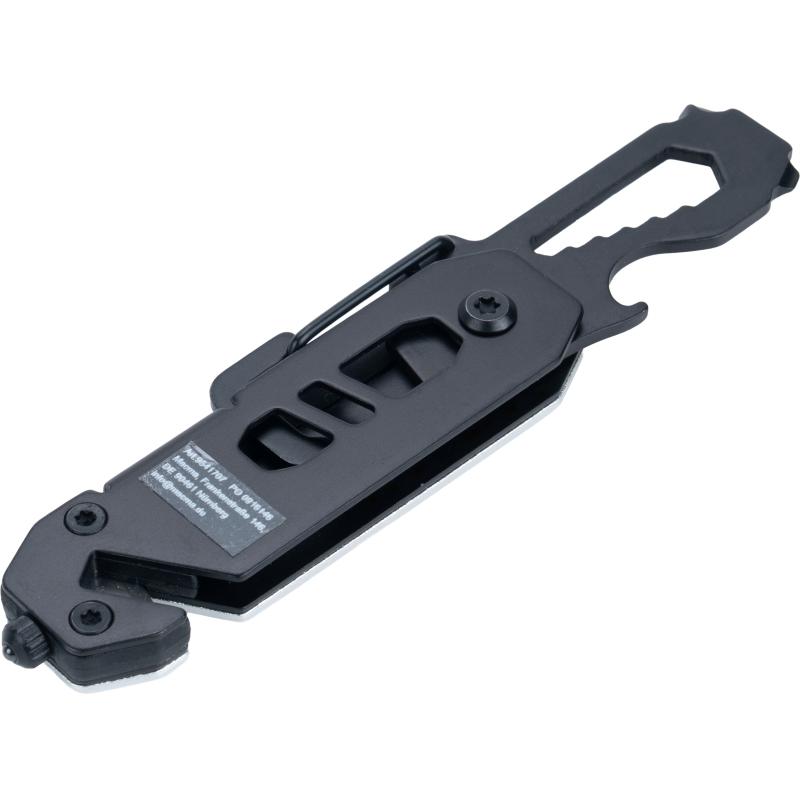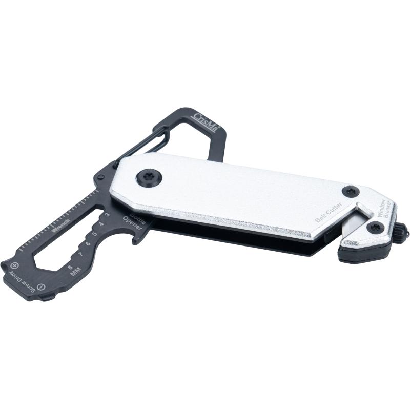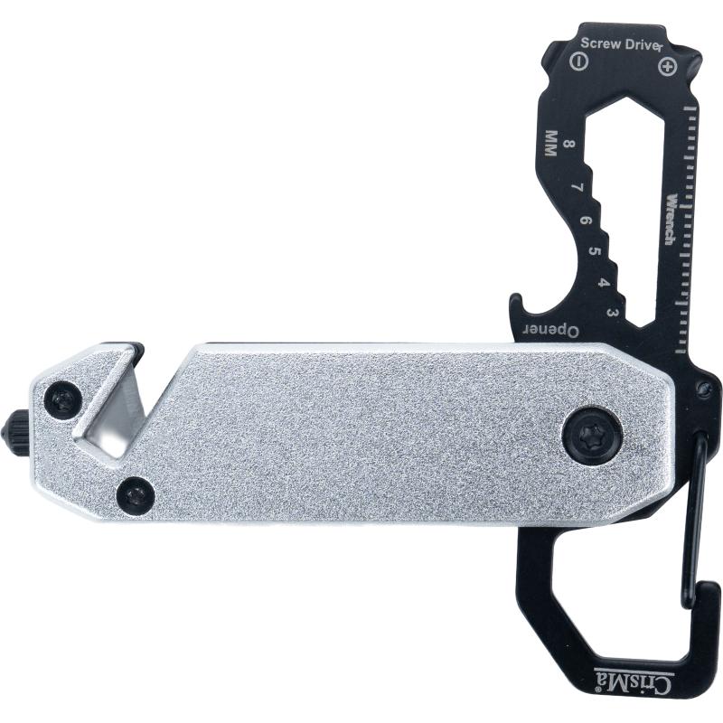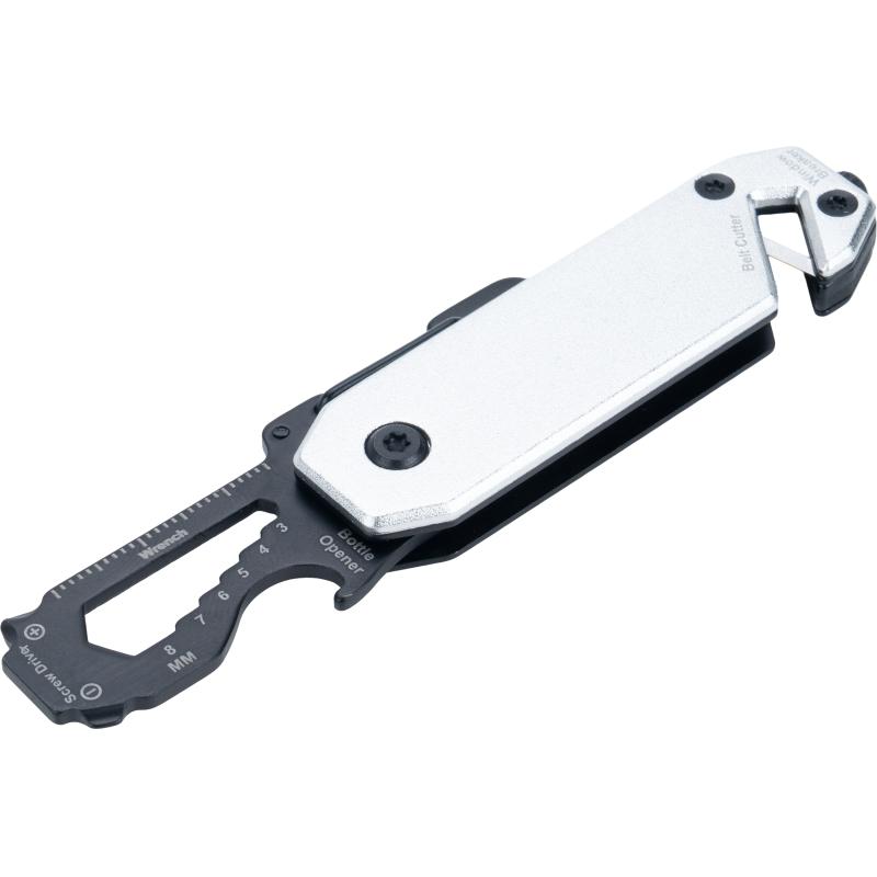 Multitool z aluminiową obudową i narzędziami ze stali nierdzewnej. Wyposażony w klucze płaskie 3–8 mm, śrubokręt krzyżakowy, śrubokręt płaski, karabińczyk, otwieracz do butelek, przecinak do pasów bezpieczeństwa oraz młotek bezpieczeństwa do rozbijania szyb.