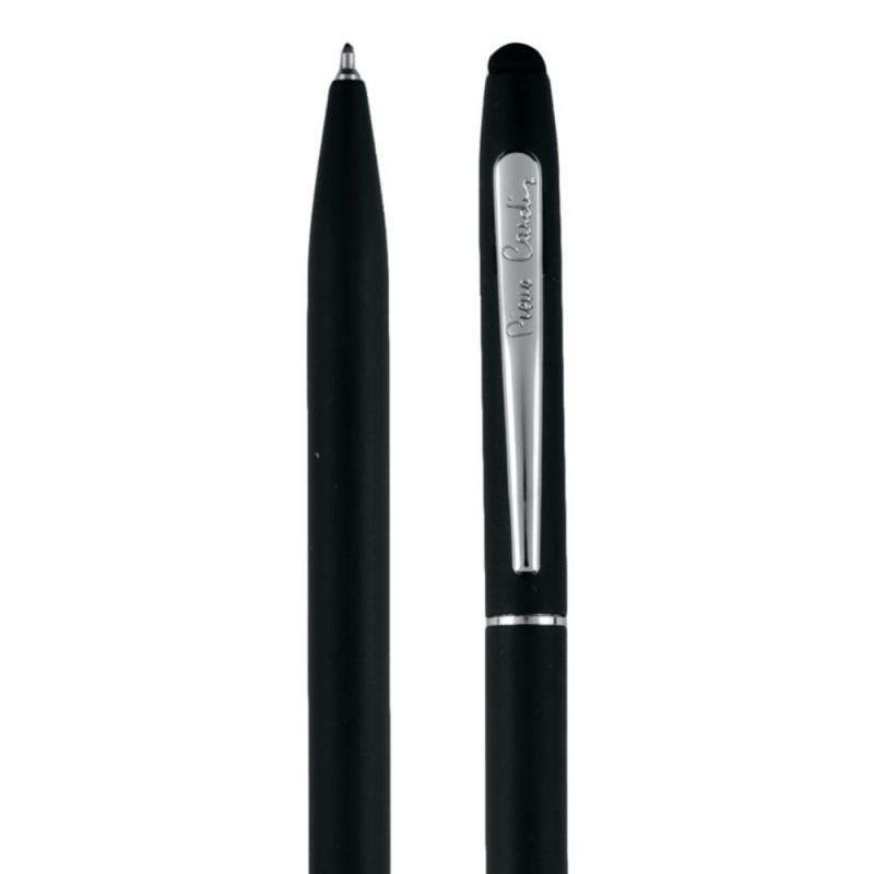 Elegancki długopis z czarnym, matowym korpusem oraz mechanizmem obrotowym. Wyposażony w wysokiej jakości niebieski wkład z końcówką 0,7 mm oraz funkcję touch pen. Zapakowany w papierowe etui z certyfikatem autentyczności Pierre Cardin.