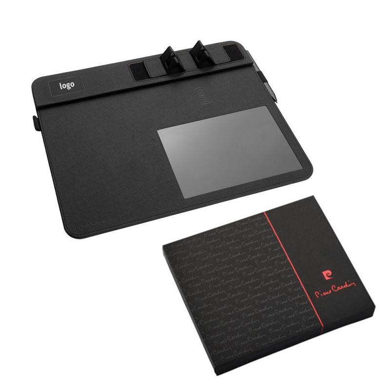 Elegancka podkładka pod mysz Pierre Cardin, wykonana z ekologicznej skóry. Podkładka zawiera ładowarkę indukcyjną 10W z wejściem 5V/2A 9V/1,67A i wyjściem 5V/1A 9V/1,1A, podstawkę na telefon komórkowy, podkładkę do pisania z rysikiem, dwie szlufki na długopisy, dodatkowe wyjście USB oraz podświetlaną plakietkę na której umieścimy Twoje logo. Podkładkę można ładować za pomocą kabla USB-C, który znajduje się w zestawie. Podkładka zapakowana w pudełko prezentowe z certyfikatem autentyczności.