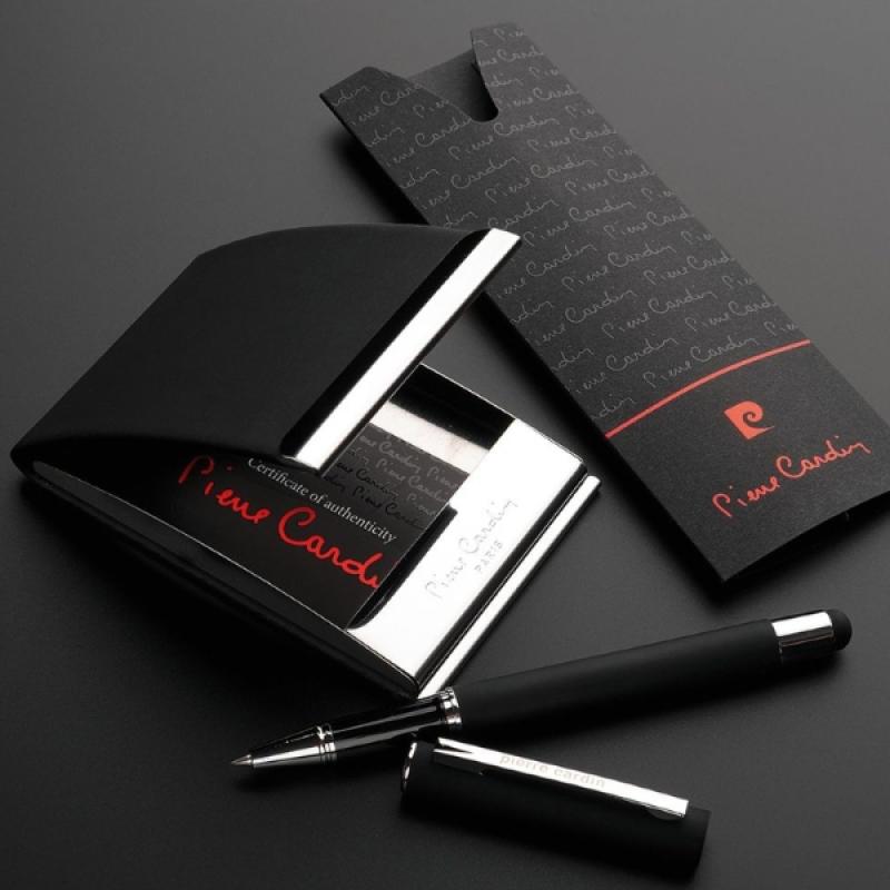 Elegancki zestaw upominkowy składający się z pióra kulkowego i wizytownika. Pióro kulkowe wyposażone zostało w niebieski wkład do wielkrotnego napełniania z końcówką 0,5 mm i funkcję touch pen. Wizytownik wykonany ze stali nierdzewnej z przyjemną w dotyku powierzchnią. Całość zapakowana w eleganckie pudełko prezentowe z certyfikatem autentyczności Pierre Cardin.