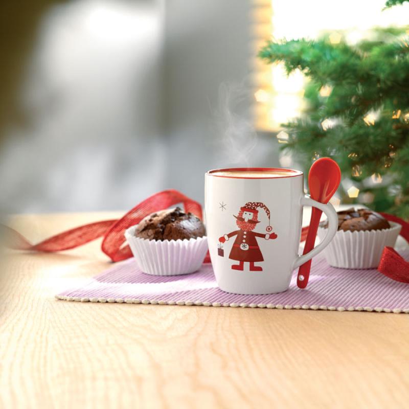 Kubek ceramiczny 250ml z łyżeczką, ozdobiony motywem Mikołaja. W pudełku z tym samym zdobieniem.