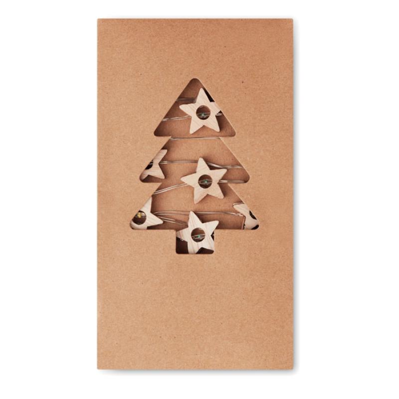 Łańcuch świetlny 20 LED, lampki w kształcie drewnianych gwiazdek. Zapakowany w kartonowe pudełko. 2 baterie AA nie dołączone. Przycisk włączania / wyłączania w obudowie baterii.
