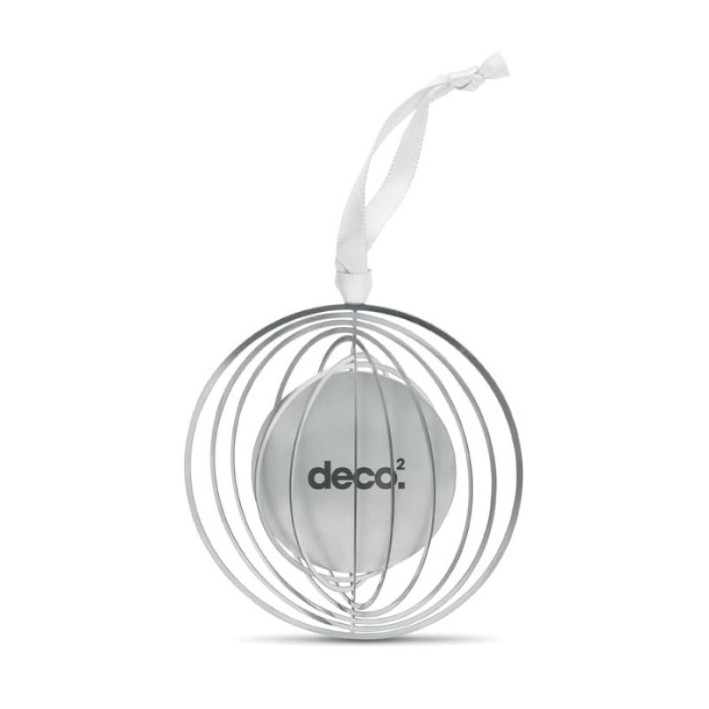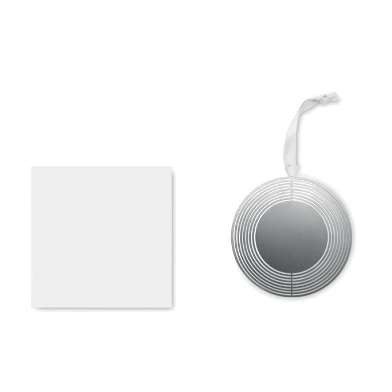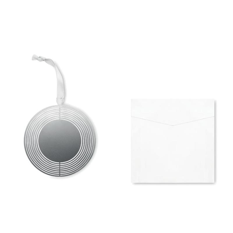Dekoracja w kształcie koła ze stali nierdzewnej ze wstążką w kopercie prezentowej.