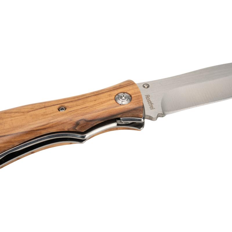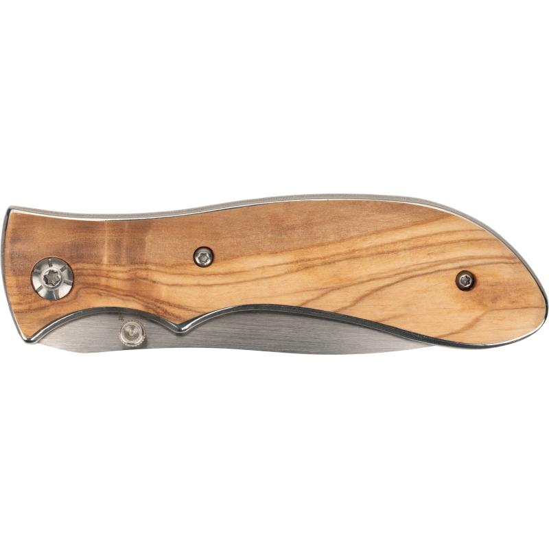 Nóż kieszonkowy, wykonany z metalu z drewnianą rękojeścią.