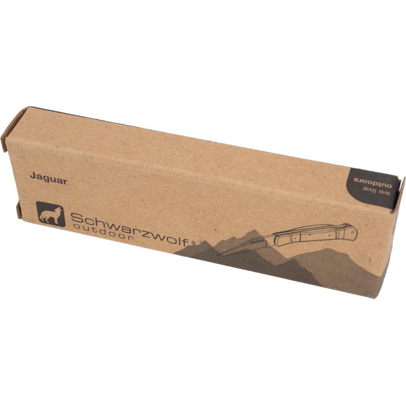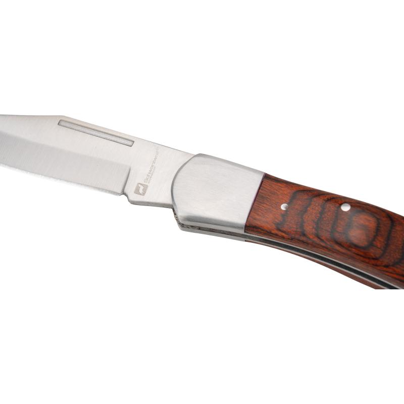 Składany nóż wykonany ze stali nierdzewnej, z drewnianą rękojeścią i blokadą bezpieczeństwa.