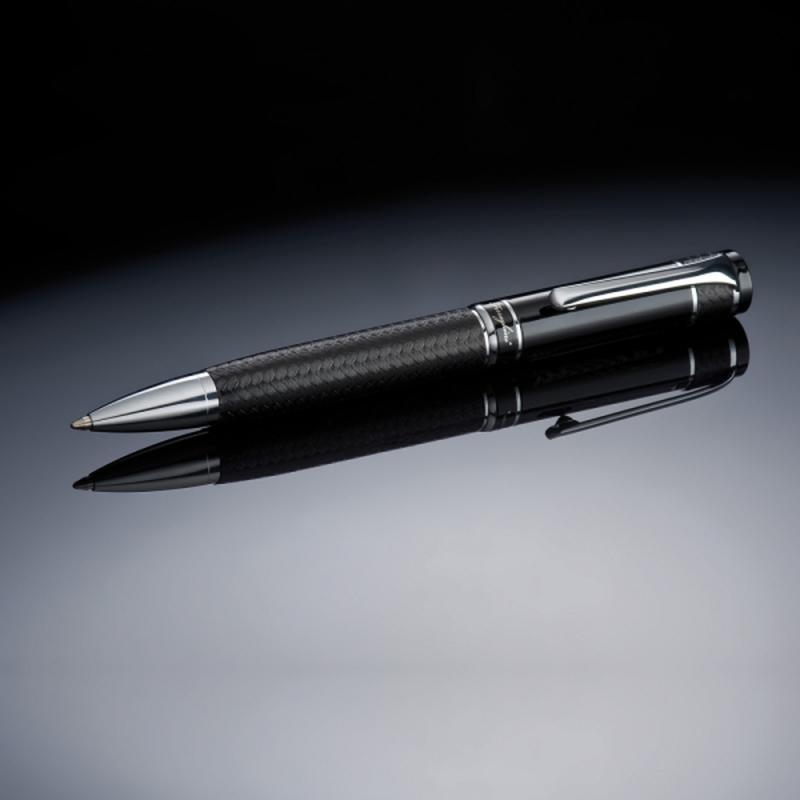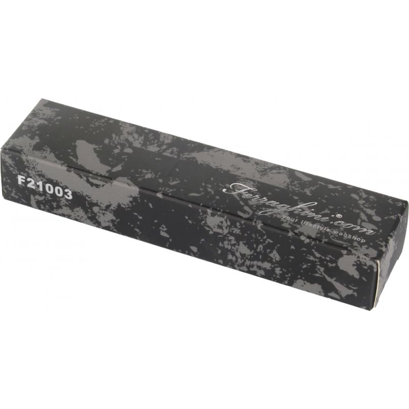 Luksusowy długopis z kolekcji Ferraghini, wyposażony w niebieski wkład. Wykończony delikatnym, przeplatanym materiałem, błyszczącym, czarnym lakierem oraz chromowanymi elementami. W zestawie z dopasowanym, skórzanym etui z magnetycznym zamknięciem, którego wnętrze zostało wyściełane delikatnym zamszem.