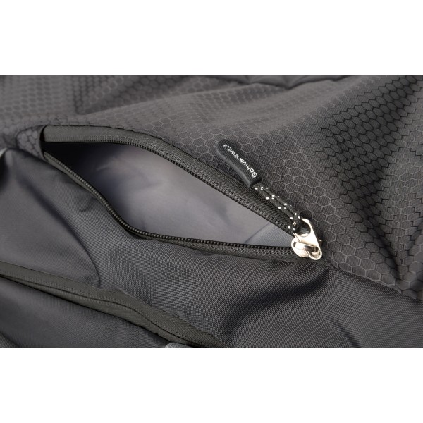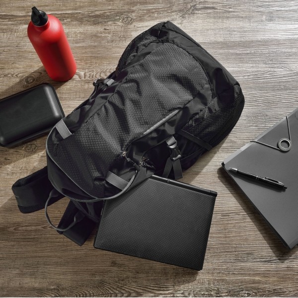 Plecak posiada watowane plecy i szelki z uchwytami, praktyczną kieszeń z zabezpieczeniem na laptop, dwie kieszenie na butelki, taśmy kompresyjne, kieszeń na buty, kieszeń wewnętrzną z przedziałką na drobiazgi oraz karabińczyk. Materiał: 300D nylon, dobby nylon, 210D poliester. Pojemność: 27 l.