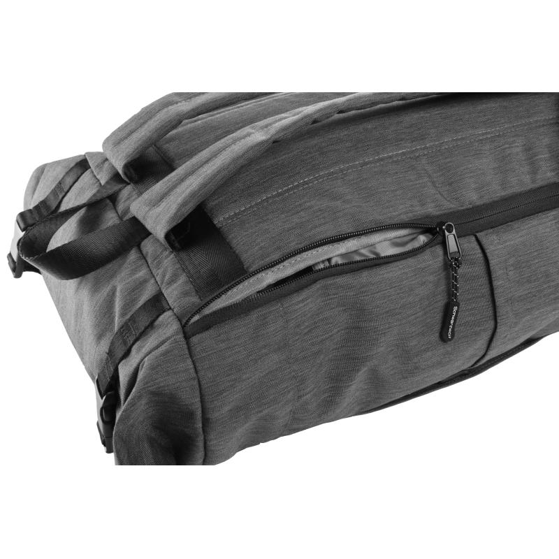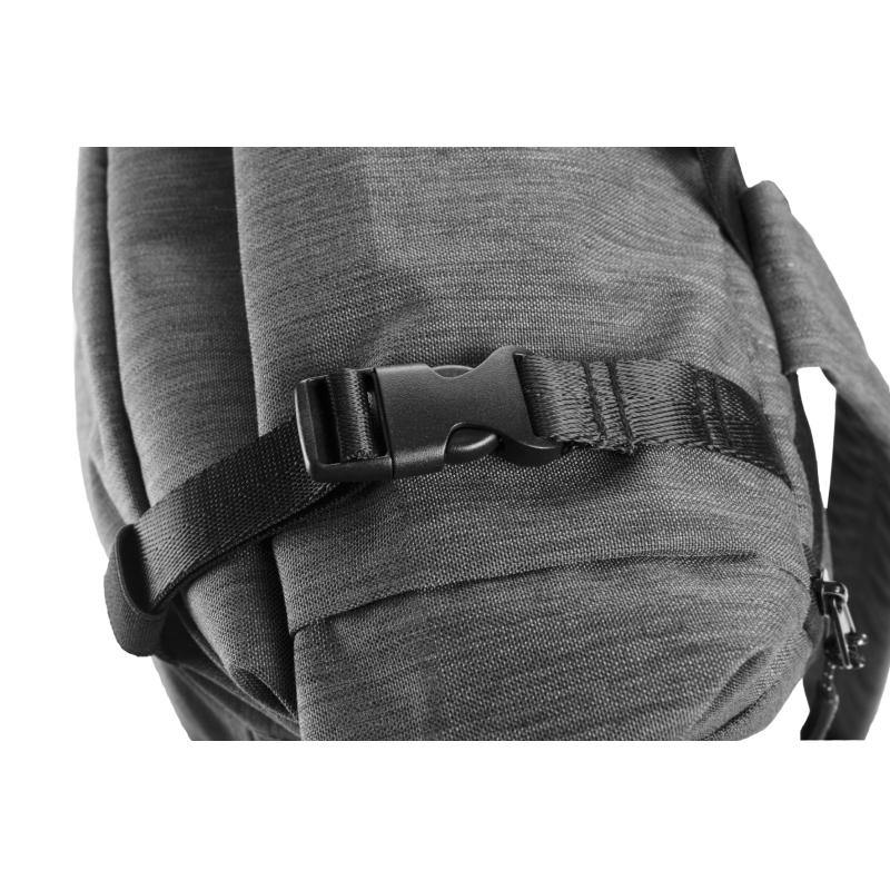 Plecak ze zwijanym zamknięciem, wyposażony w dwie frontowe kieszenie zapinane na zamek, dwie boczne kieszonki, zamek z tyłu zapewniający dostęp do dużej komory głównej, która została wydzielona na jedną dużą kieszeń oraz jedną małą - na akcesoria. Po zrolowaniu górnej części plecaka całość zamykamy dwoma paskami z plastikowymi klamerkami. Plecak posiada watowane szelki i plecy.
