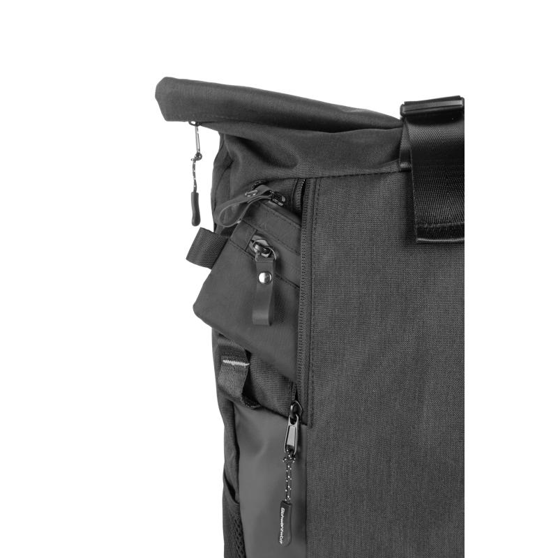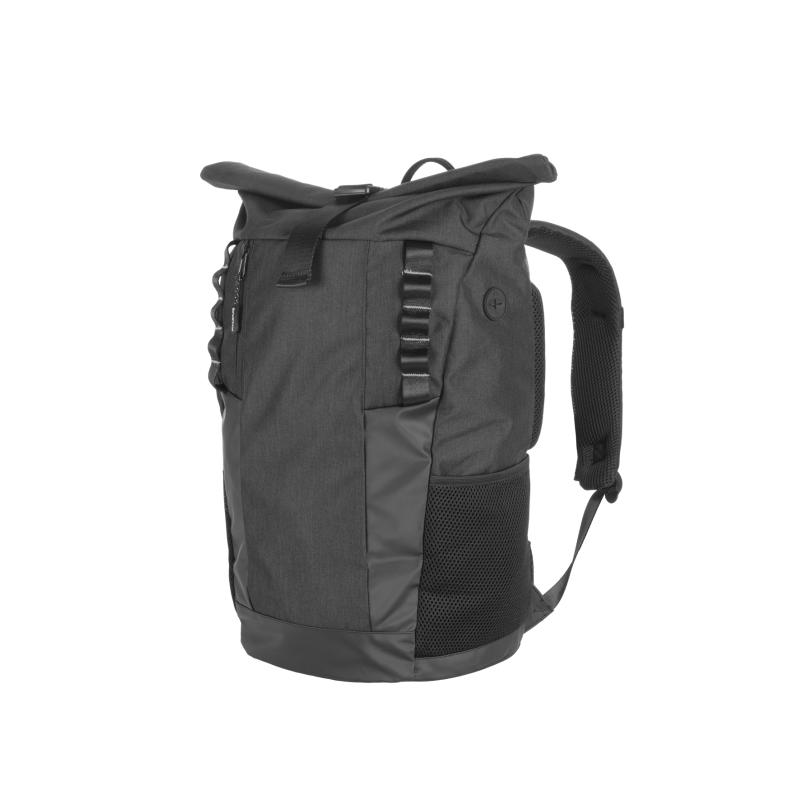 Plecak ze zwijanym zamknięciem, z watowanymi szelkami i plecami, wyposażony w dużą komorę główną z jedną oddzielną kieszenią i mniejszą kieszonką na akcesoria. Z przodu plecaka znajduje się mała kieszonka zamykana na zamek, po bokach dwie siatkowe kieszenie i jedna mała kieszonka z tyłu. Po zrolowaniu górnej części plecaka całość zamykamy dwoma paskami z plastikowymi klamerkami - tak zamknięty plecak będzie miał pojemność 25l. Plecak można również zamknąć bez rolowania, na zamek błyskawiczny - wtedy pomieści 32l.